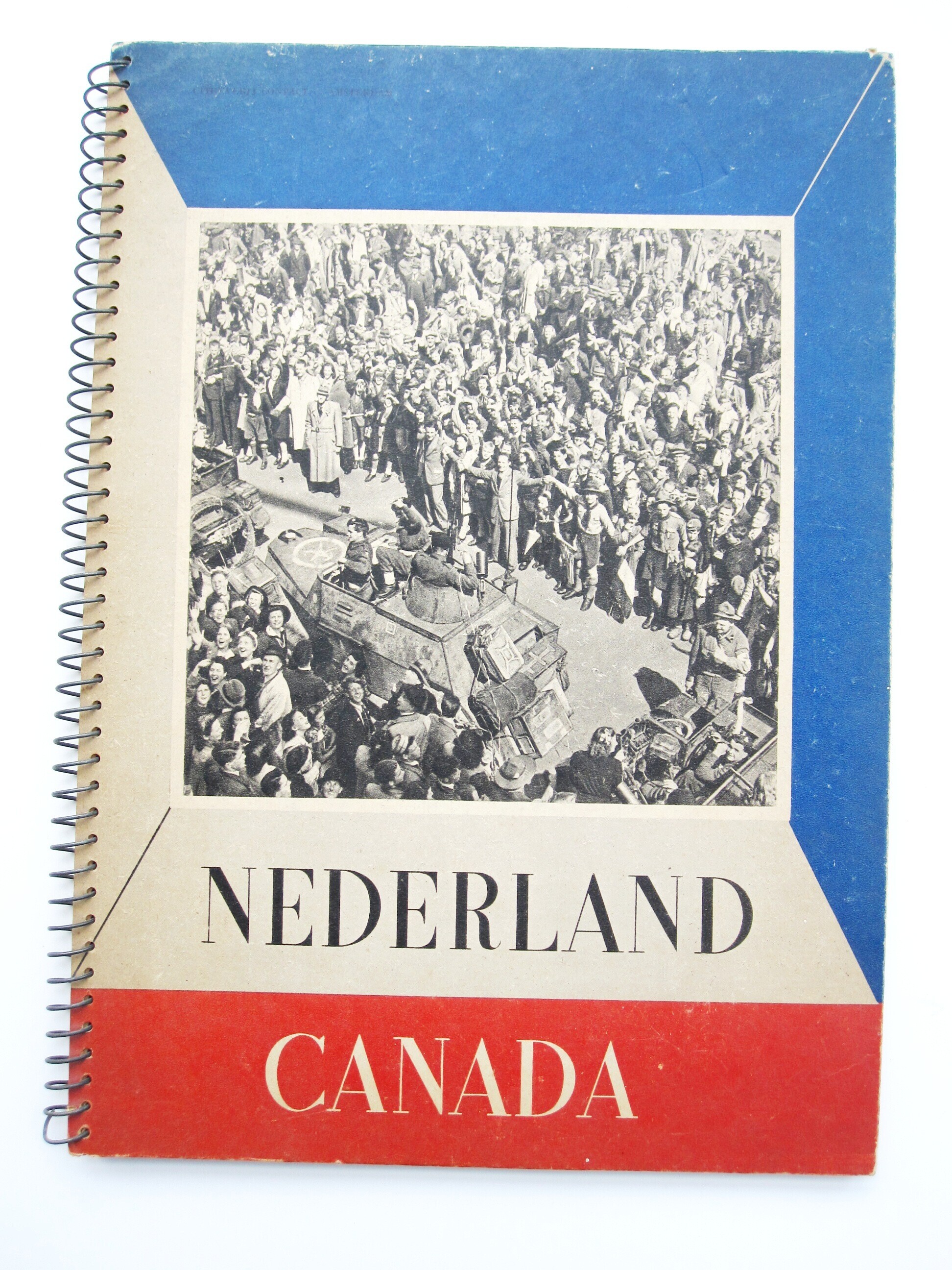 Een in een ringband met hard kartonnen kaft gebonden boek met de titel: "Nederland - Canada" uitgegeven door uitgeverij Contact: Amsterdam/Antwerpen met medewerking van de Canadian Army Public Relations Services en de Canadian Film and Photo Unit. Het boek telt 150 foto's met voorwoord namens het Comité Canada-Nederland door de voorzitter G.H. Crone en een historisch overzicht van de krijgsverrichtingen van het Canadese leger door J. Nikerk, de secretaris van het Comité.