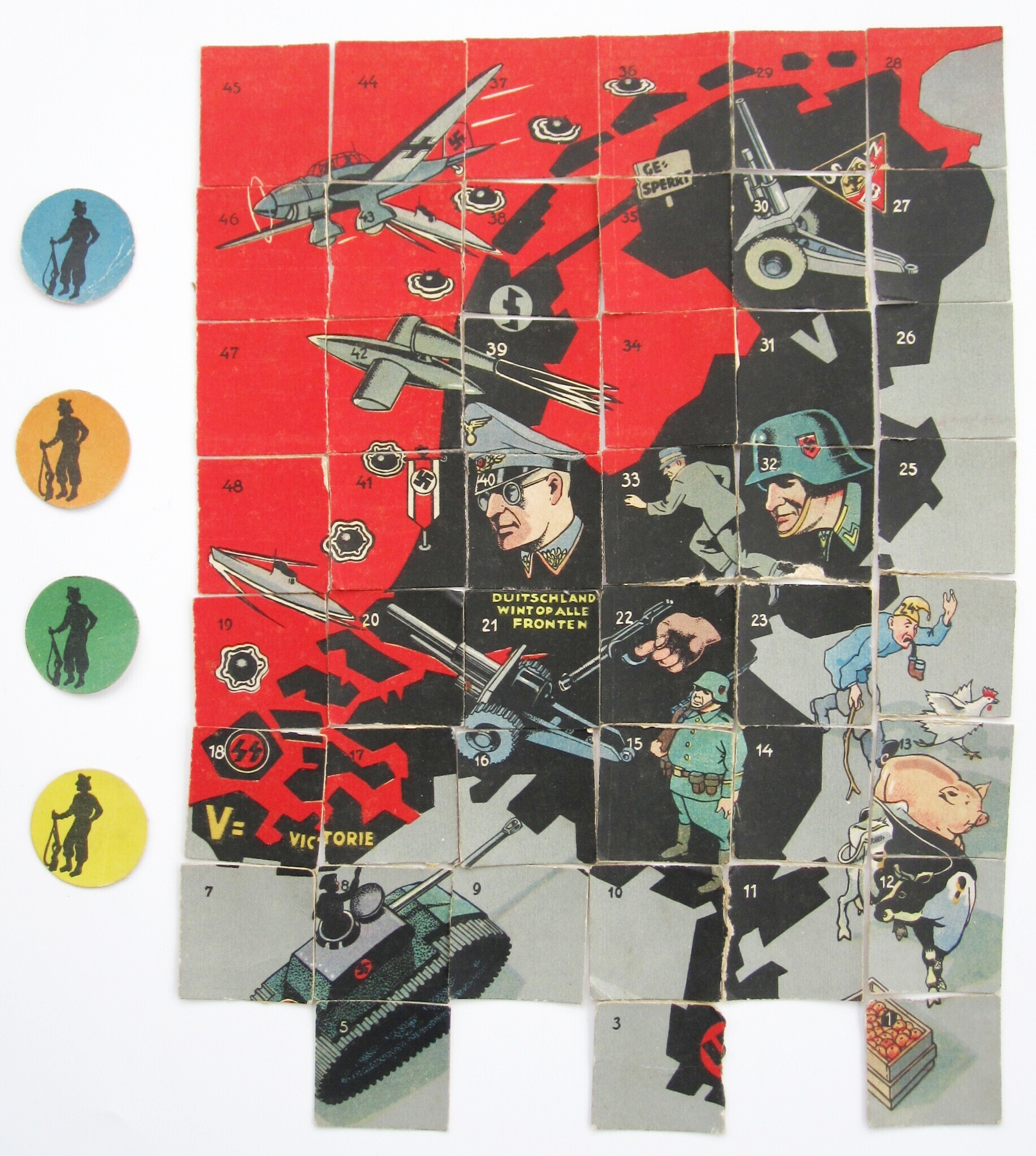 Een puzzel in kleur afgedrukt op dik papier met de kaart van Nederland. Op de achterkant van de stukken staat een puntenaantal en bij enkele een beschrijving van een militair feit. Toegevoegd zijn vier ronde papieren fiches met de afbeelding van een militair. De puzzel kan eveneens worden gebruikt als spel. Drie puzzelstukjes ontbreken.