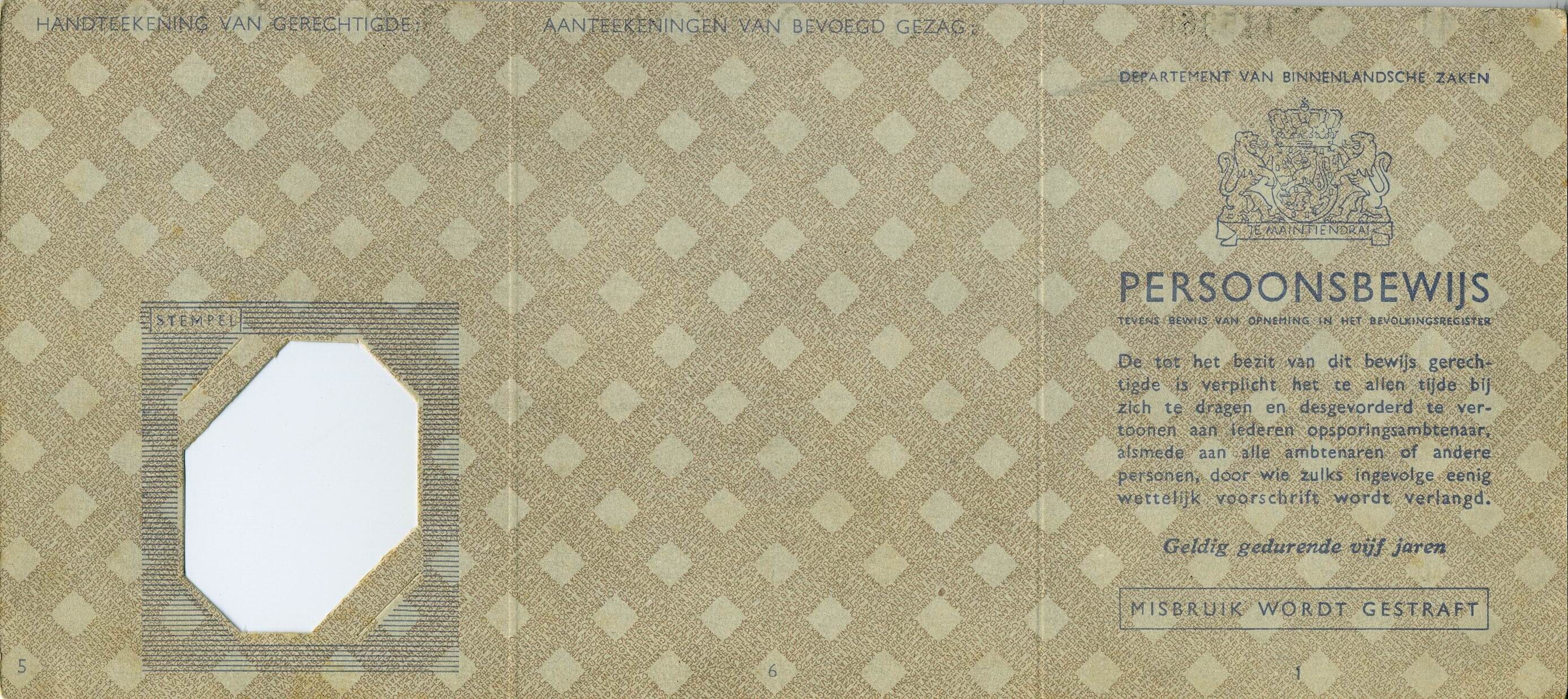 Twee lege persoonsbewijzen met plaats van uitgifte 's-Gravenhage. Tien ongebruikte zegels voor een persoonsbewijs: vier van 50 cent, vier van 1 gulden en twee zegels van 2 gulden. Tevens een vrijwel volledig blad met controle zegels die zowel voor het persoonsbewijs als voor de Tweede Distributie Stamkaart werden gebruikt. Mogelijk gaat het hier om vervalsingen of gestolen exemplaren. De lege persoonsbewijzen en de zegels werden gebruikt door het verzet.