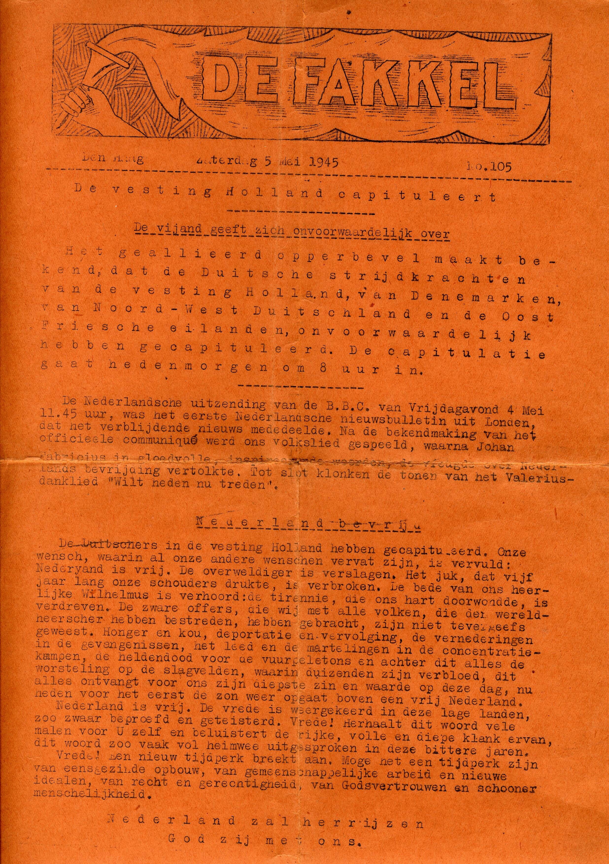 Een uitgave van de verzetskrant "De Fakkel, Den Haag Zaterdag 5 mei 1945 no. 105" op één kant gedrukt op oranje dik papier.