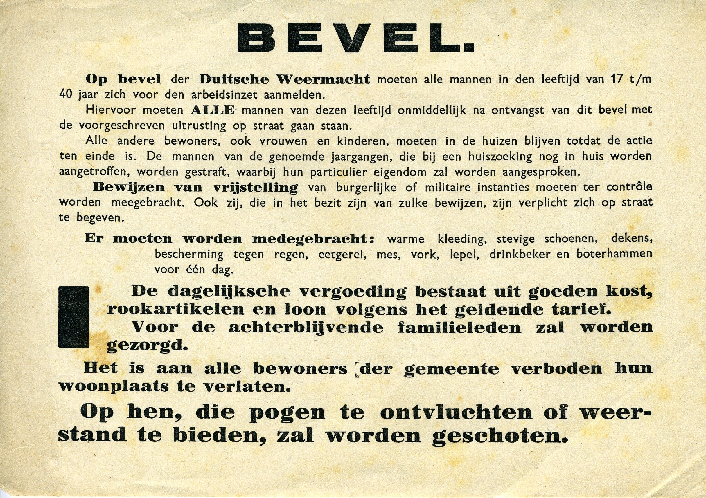Een gedrukt pamflet met het bevel dat op last van de Duitse Weermacht alle mannen in de leeftijd van 17 t/m 40 jaar zich moeten melden voor de arbeidsinzet.