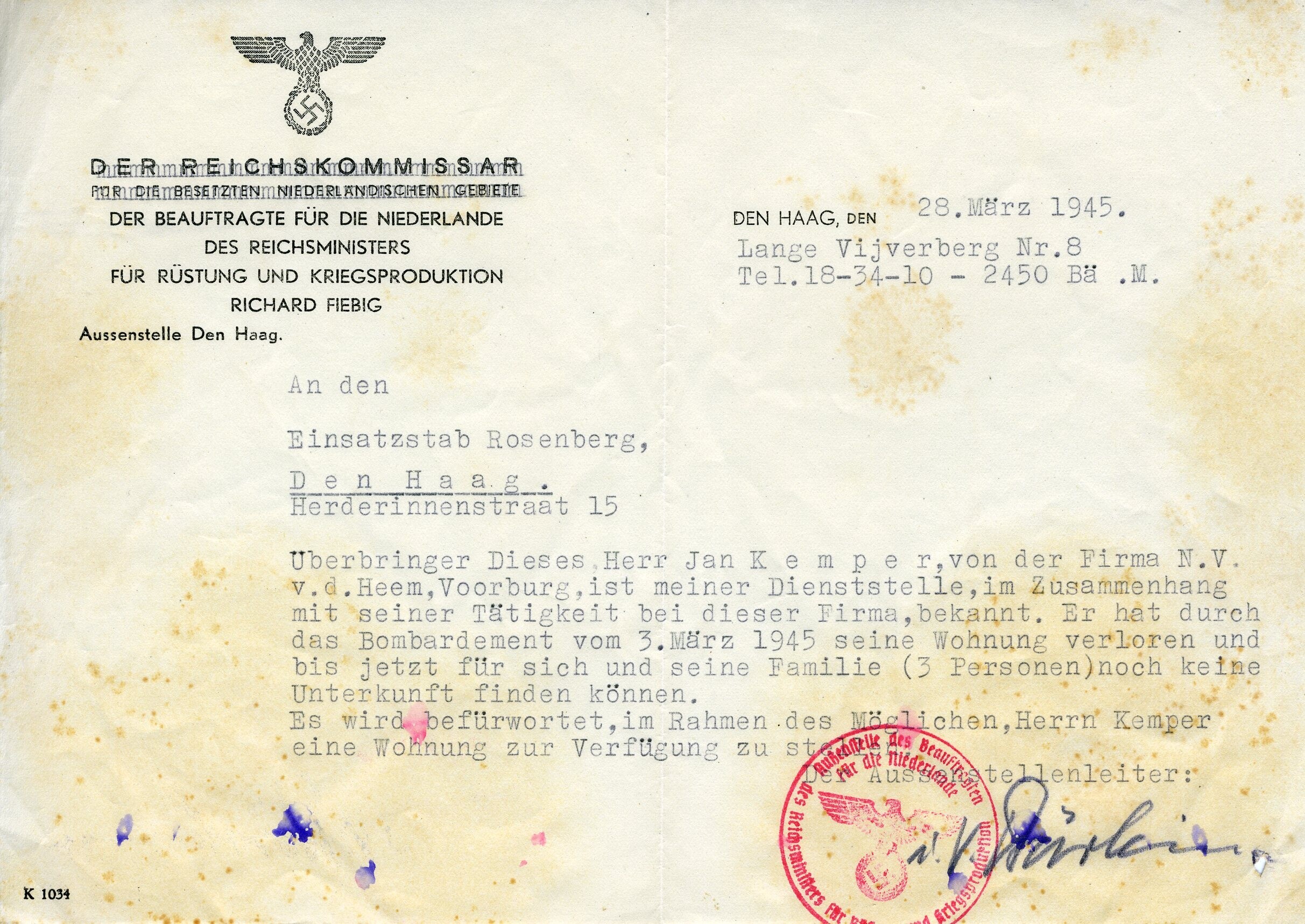 Een brief waarin wordt aangedrongen op het verstrekken van een woning aan Jan Kemper van de firma N.V. v.d. Heem te Voorburg, aangezien deze bij het bombardement van 3 maart 1945 zijn woning is verloren.