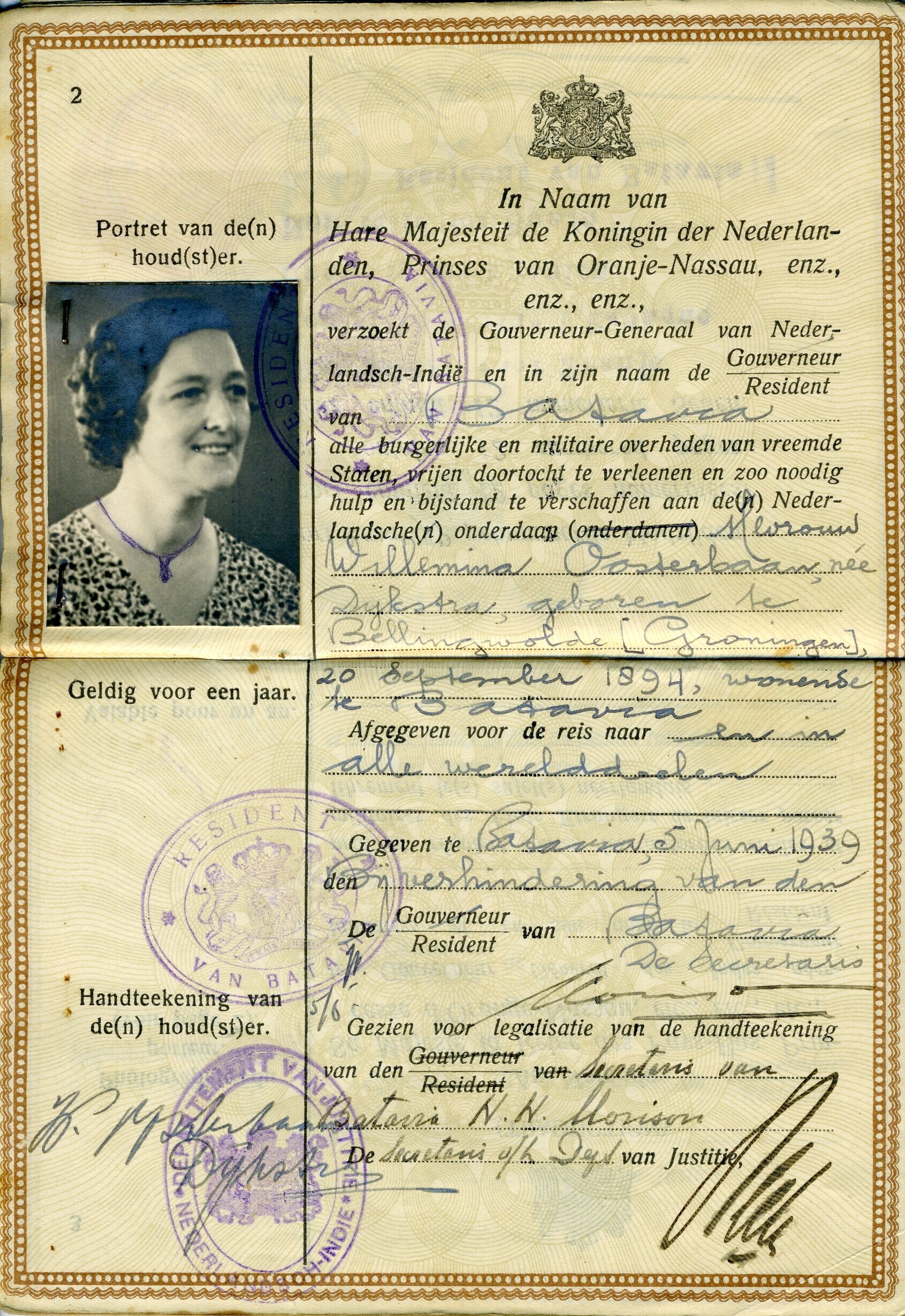 Een paspoort uitgegeven te Batavia op 5 juni 1939 op naam van "Mevrouw Willemina Oosterban, née Dijkstra, geboren te Bellingwolde (Groningen), 20 september 1894, wonende te Batavia" met pasfoto van de houdster. Het paspoort draagt het zegel van Nederlands-Indië, stempels van de resident en het departement van Justitie van Nederlands-Indië en is geldig voor reizen door de hele wereld behalve Spanje. Het paspoort is verder afgestempeld door de Harbour Police te Colombo op 21 juni 1939; met het zegel van de gemeente 's-Gravenhage voor opname in het bevolkingsregister op 26 augustus 1939 en een stempel met zegel van het Ministerie van Koloniën voor legalisatie op 29 mei 1940 en een onduidelijk stempel. Toegevoegd is een los blad met de tekst van het "Besluit Internationaal Betalingsverkeer Nederlandsch-Indië 1934 (Staatsblad No. 634)" met bijzondere aandacht voor verlofgangers.