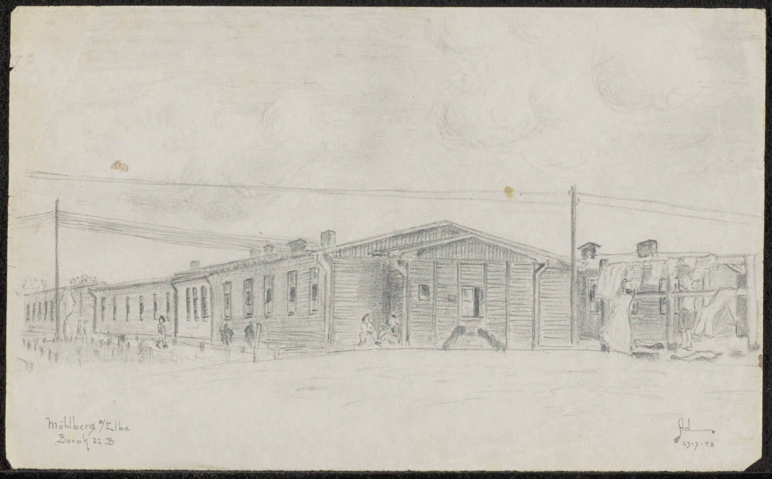 Een potloodtekening van lage barakken met enkele personen. Boven de barakken lopen elektriciteitsdraden. Geheel rechts is een persoon bezig met de was of het luchten van beddengoed. Linksonder: "Mühlberg a/Elbe Barak 22 B". Rechtsonder signering: "Ad.. 23-7-43".