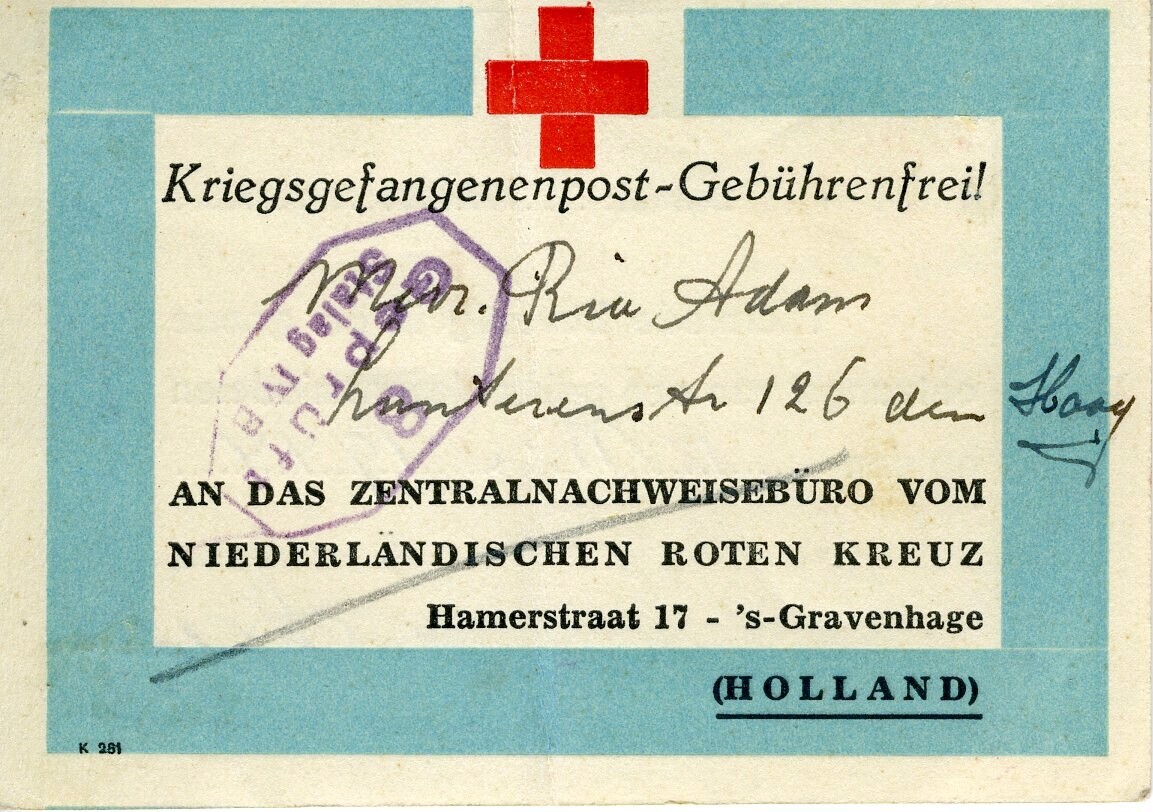 Een kaartje met op de voorkant: "Kriegsgefangenenpost-Gebührenfrei; Mevr. Ria Adam, Lunterenstr. 126 Den Haag; an das Zentralnachweisebüro vom Niederländischen Roten Kreuz Hamerstraat 17 - 's-Gravenhage Holland". Op de achterkant: "On est prié de retourner cette carte; afz Ria Adam Lunterenstr 126 Den Haag+ Datum 2 mei 1944+ Hiermede bevestig ik de goede ontvangst van een pakket levensmiddelen op den 15 mei 1944+ Aan sergeant Boy Adam no. 106900 m. Stammlager 7 B Mühlberg / Elbe".