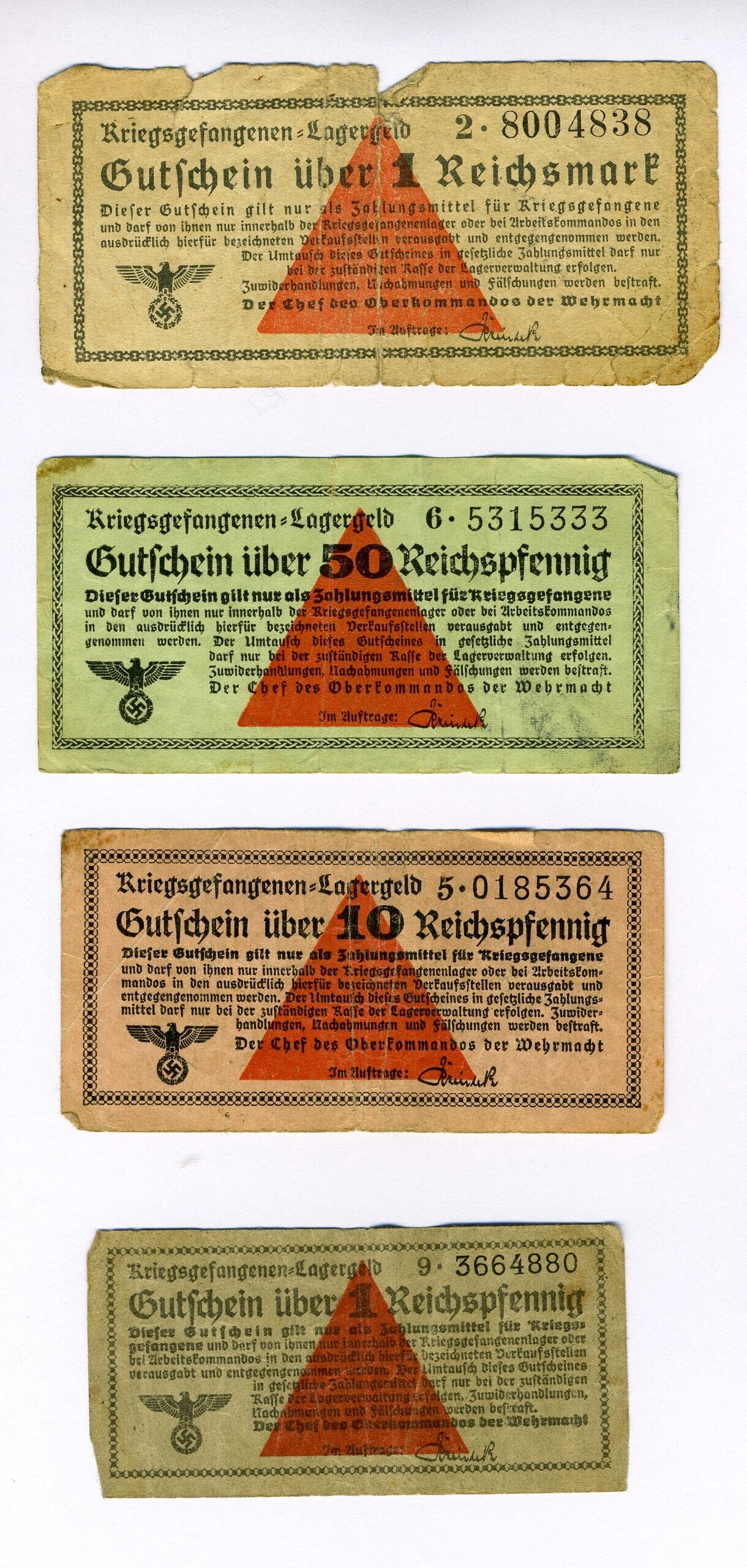 Vier waardepapieren alleen bedoeld voor krijgegevangenen met linksboven: "Kriegsgefangenen-Lagergeld" met achtereenvolgens de waarden: 1Reichsmark; 50 Reichspfennig; 10 Reichspfennig; 1 Reichspfennig.