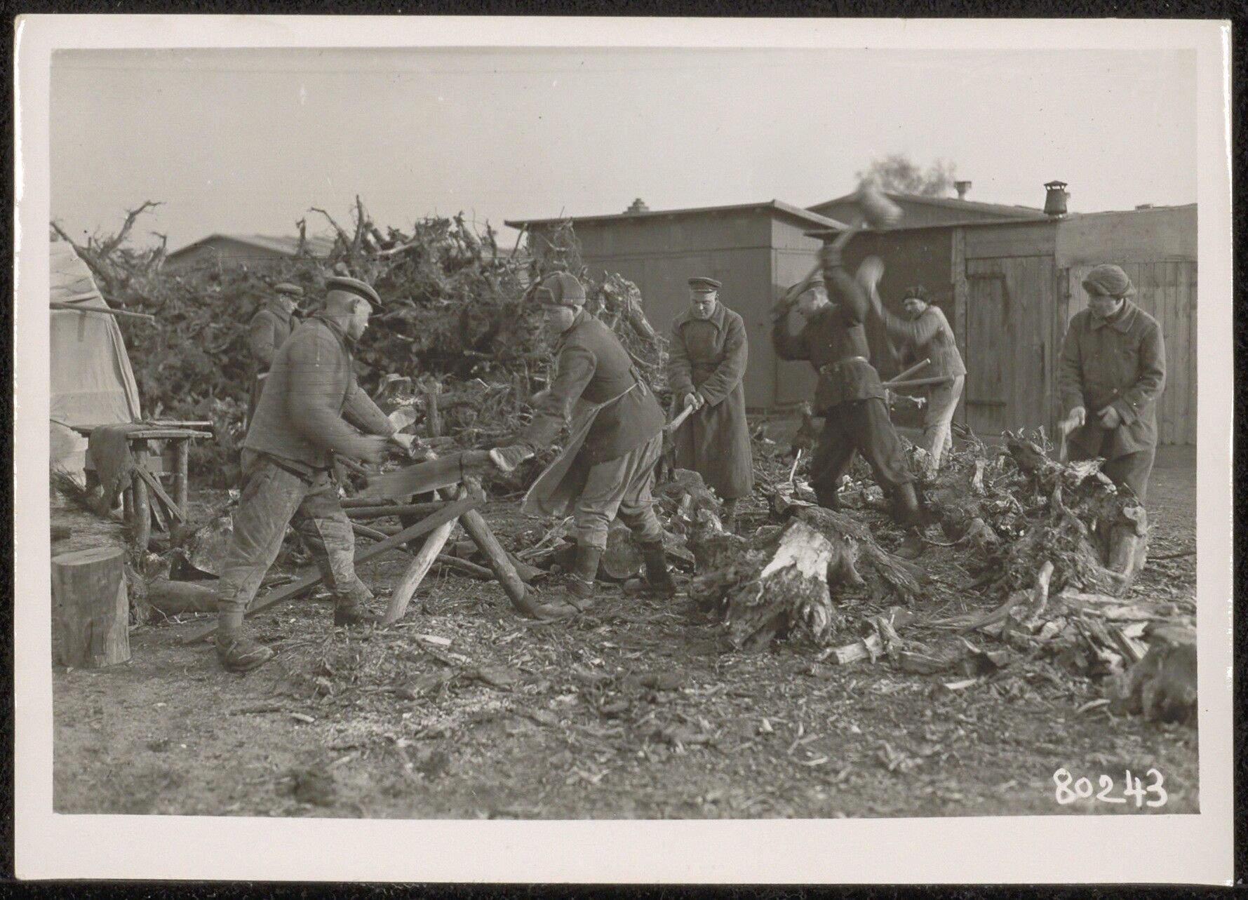 Een zwart-wit foto van het klein hakken van hout in het krijgsgevangenenkamp Mühlberg an der Elbe.