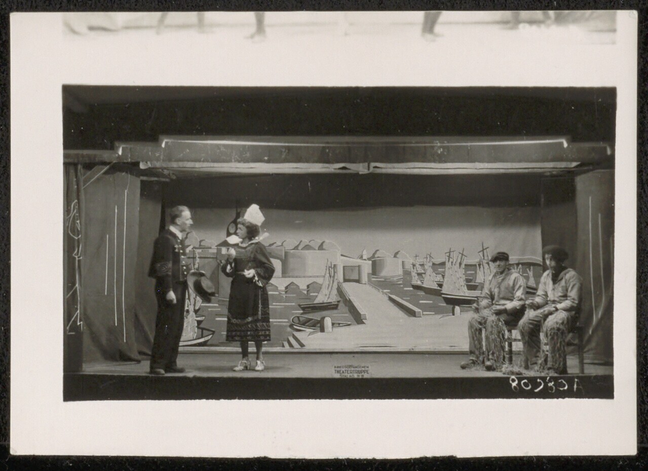 Zes zwart-wit foto's van theateruitvoeringen in het krijgsgevangenenkamp Mühlberg an der Elbe. Op drie grote foto's zijn twee afbeeldingen boven elkaar afgedrukt. De drie andere foto's zijn afgesneden van een dergelijke grote foto.