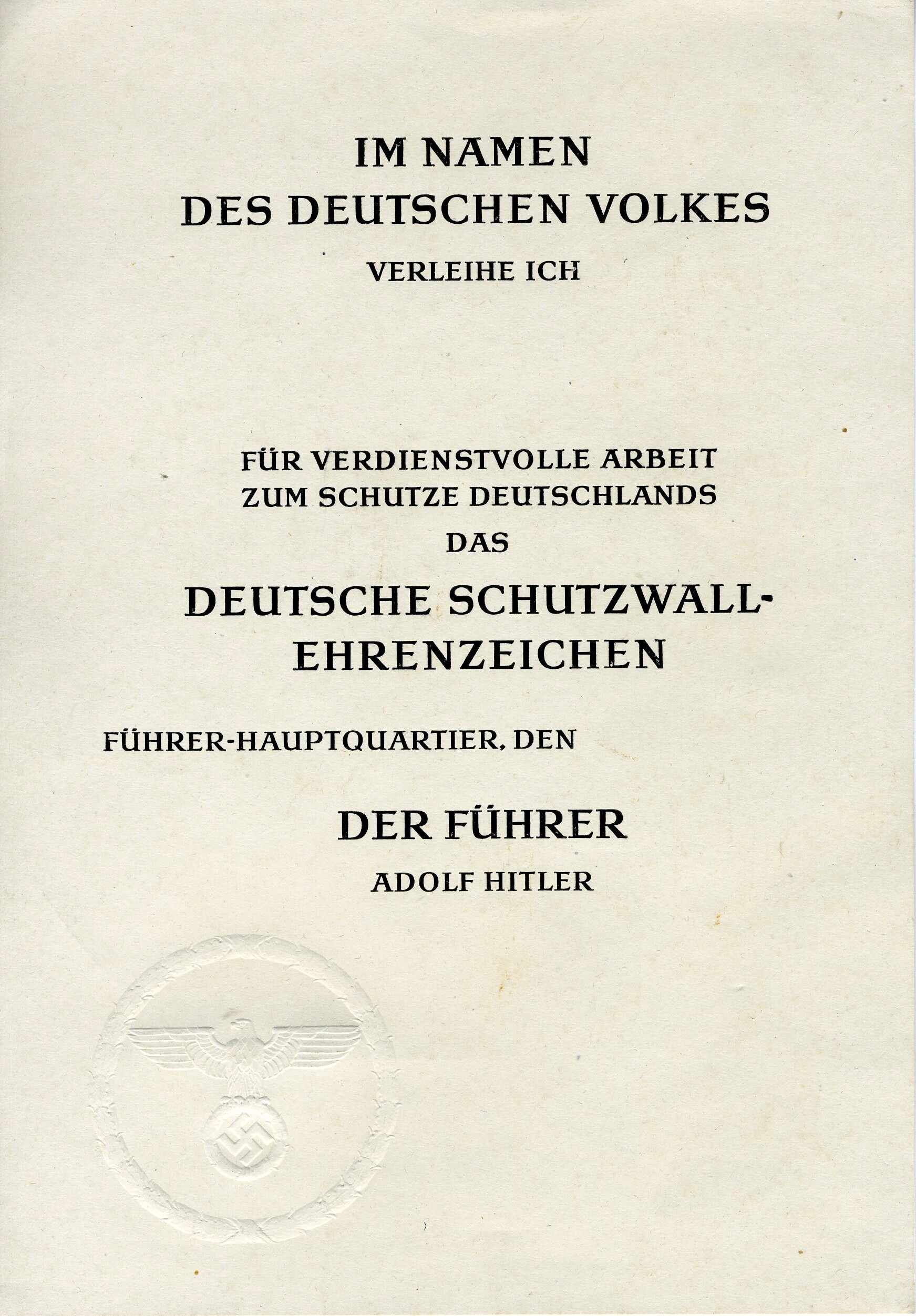 Een niet ingevulde gedrukte oorkonde behorende bij het "Deutsche Schutzwall-Ehrenzeichen" verleent in naam van "Der Führer Adolf Hitler' met de rijksadelaar als watermerk