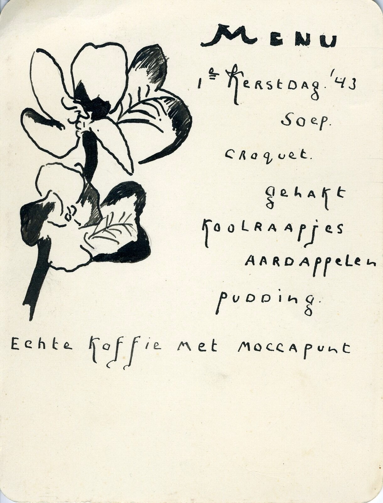 Een zelfgemaakt kerstmenu waarbij het diner wordt afgesloten met "Echte koffie met Moccapunt". Het menu is geïllustreerd met een floraalmotief. Op de achterkant staat met potlood geschreven: "Singraven Denekamp".