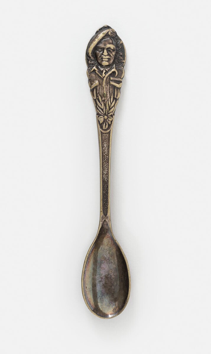 Een zilverkleurige metalen theelepeltje met op de bovenkant van de steel de afbeelding van een Canadese militair en op de achterkant van deze afbeelding: "1e Canadian Army Onze Dank Mei 1945". Aan beide kanten een versiering met florale motieven.