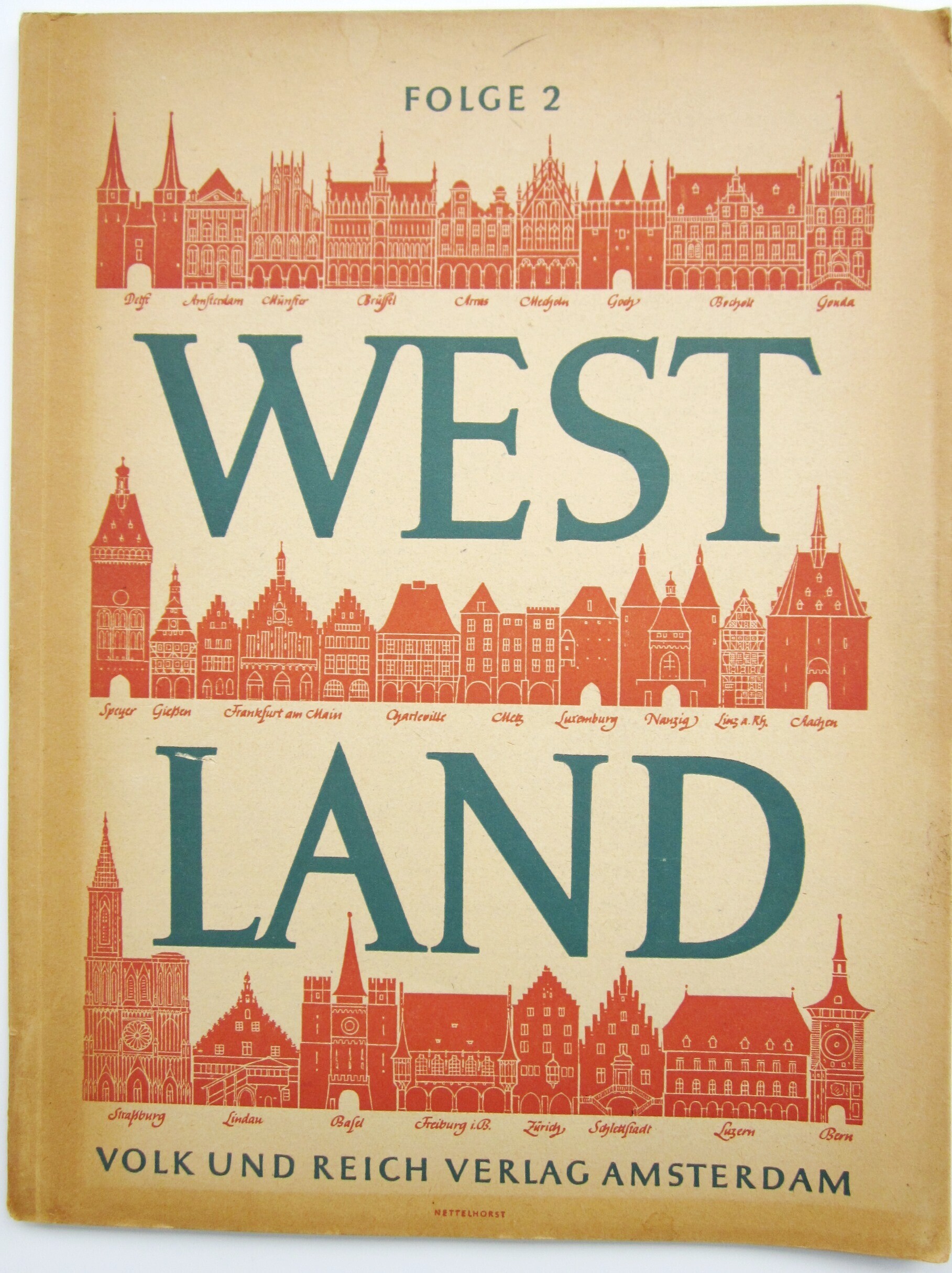 Een met een getekende kaarten en zwart-wit foto's geïllustreerde uitgave van "Westland. Folge 2. Blätter für Landschaft, Geschichte und Kultur an Rhein, Mosel, Maas und Schelde. Herausgegeben vom Reichskommissar für die besetzten Niederländische Gebiete Reichsminister Dr. Seyss-Inquart" door: "Volk und Reich Verlag Amsterdam".