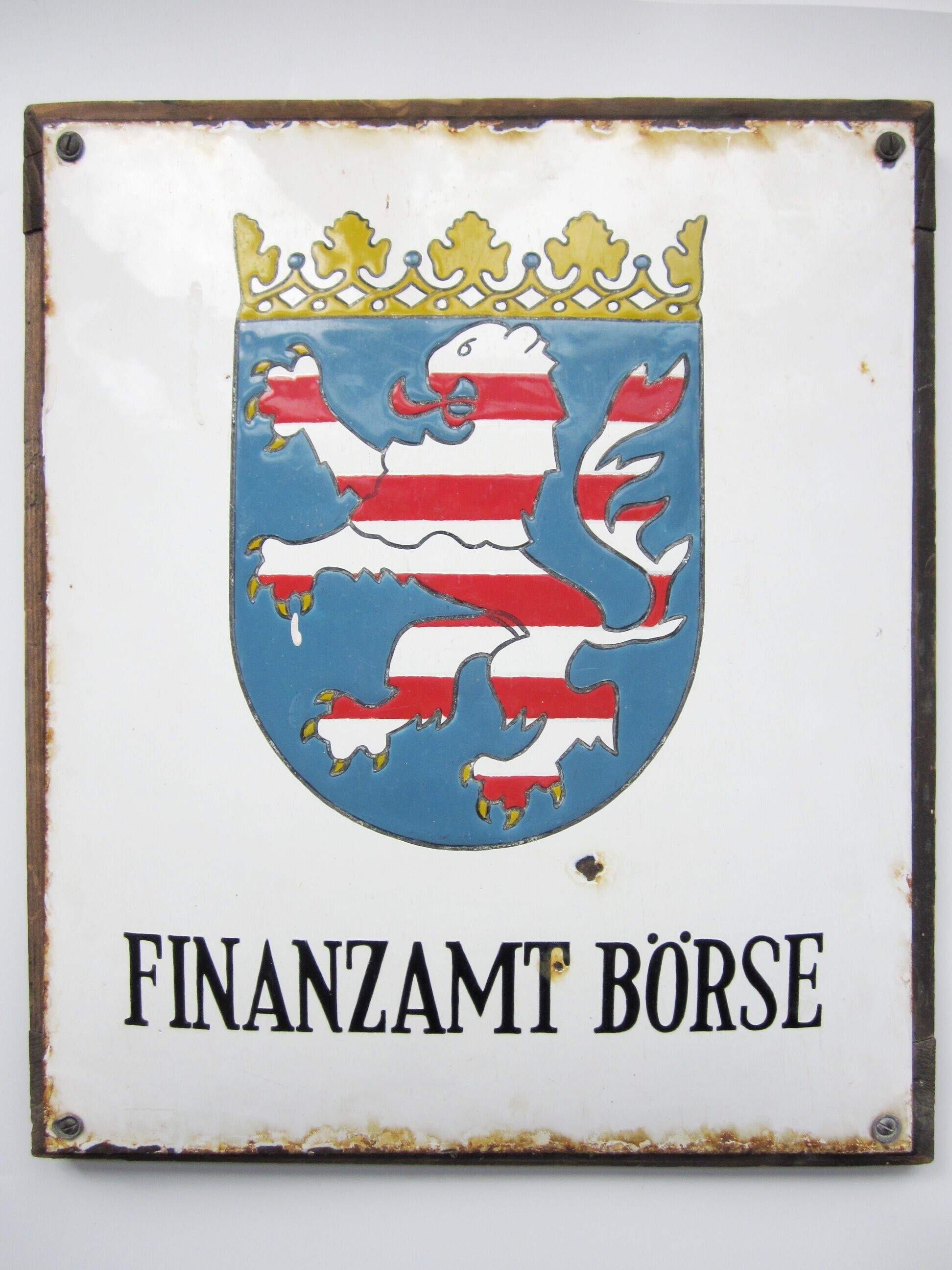 Een gevelbord bestaande uit een houten frame met daarop een geëmailleerd metalen bord. Op het email is de voorstelling aangebracht van een gekroond wapenschild met een rood-wit gestreepte klimmende leeuw op een blauw fond. Daaronder staat: "Finanzamt Börse".