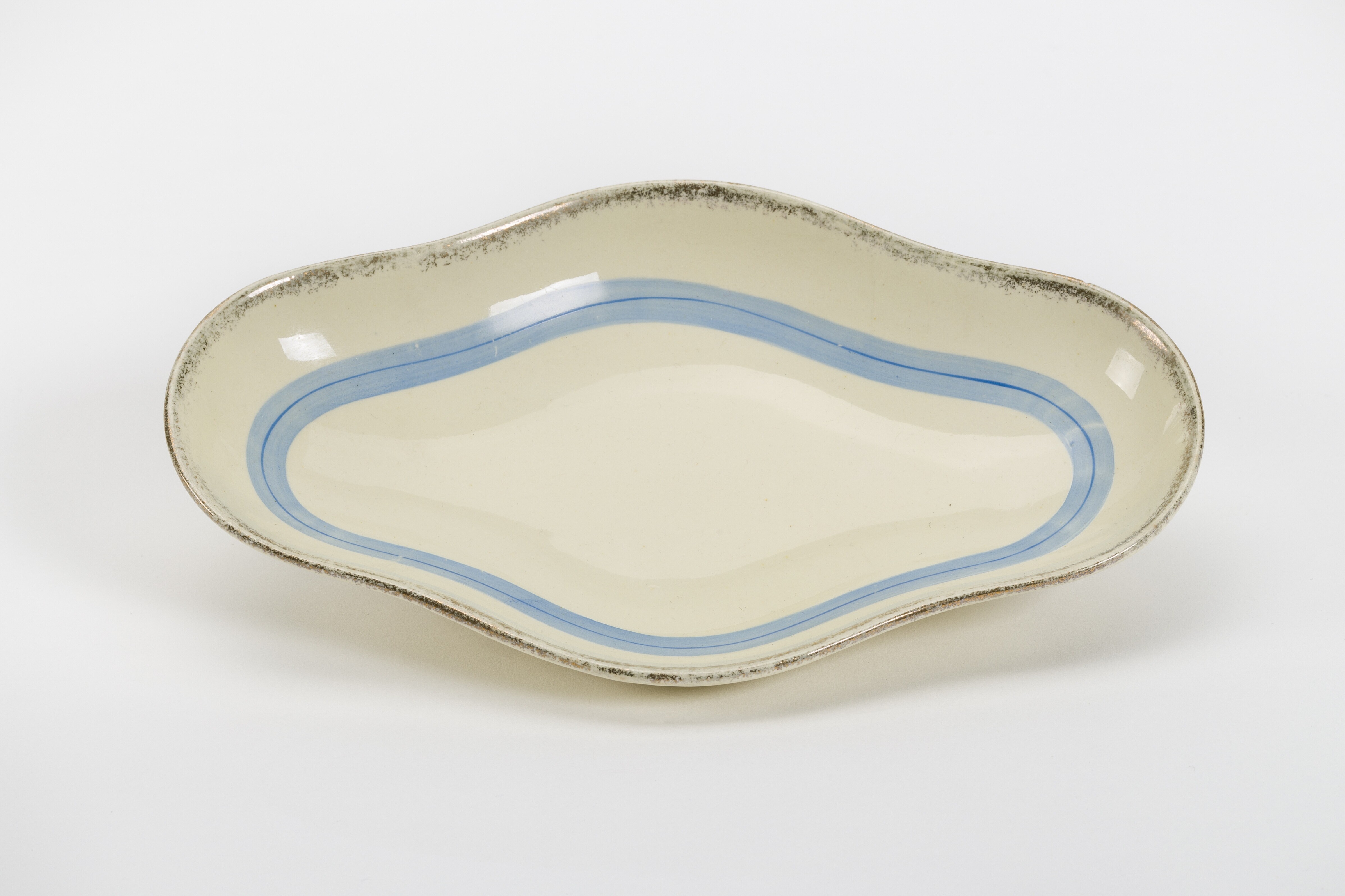 Een ovaal aardewerk schaaltje met een golvende rand en geel geglazuurd. De bovenrand was verguld en langs de rand van de bodem is een blauwe baan aangebracht te versiering. Op de onderkant van de bodem: "Marquis Skape Marigold Alfred Meakin England". Het schaaltje met twee kleine boterhammen werd aangetroffen in de Wilhelmina M.U.L.O.-school te Voorburg waar vluchtelingen van het bombardement op de Bezuidenhout even konden uitrusten.