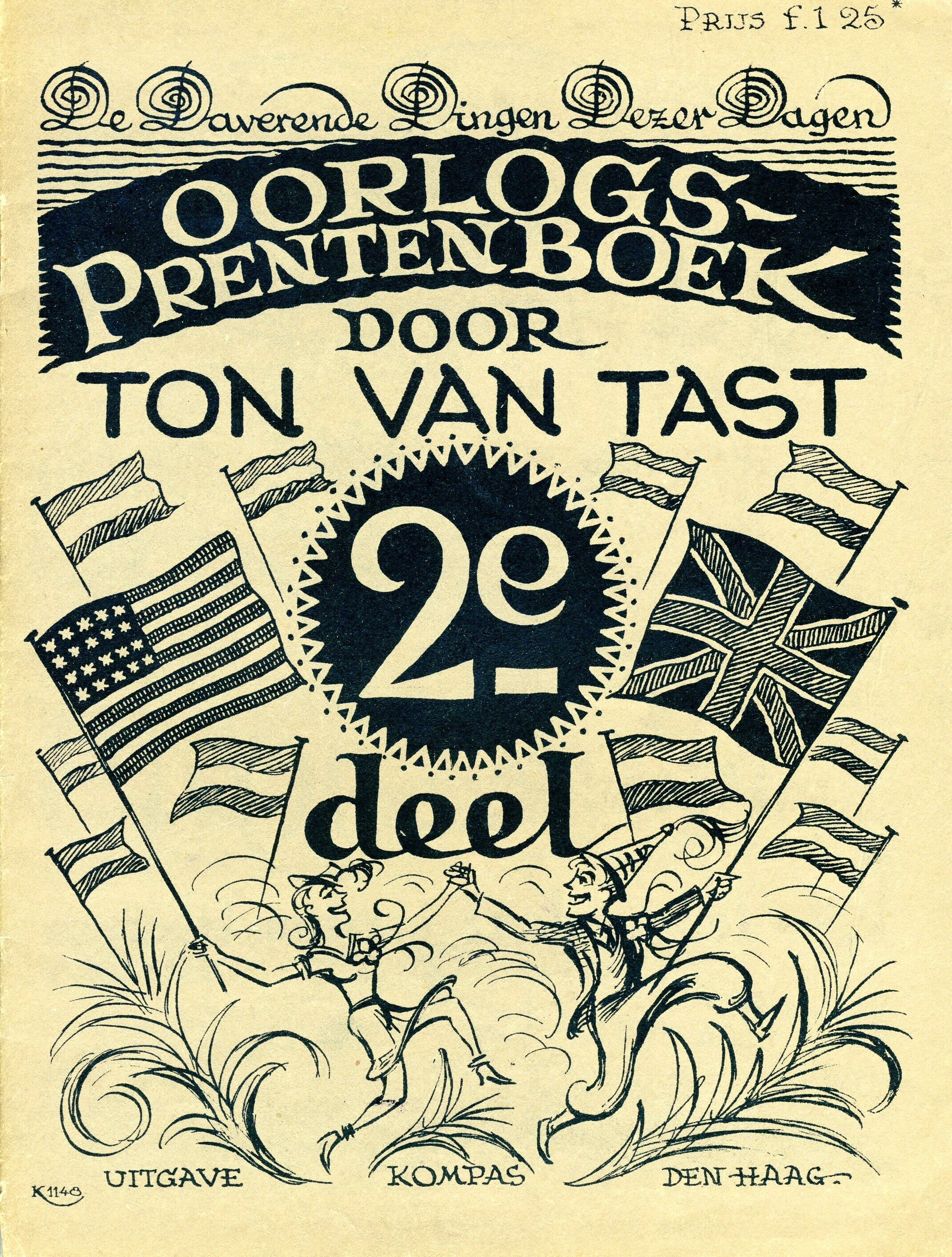 Een stripboek met op de kaft: "De daverende dingen dezer dagen. Oorlogsprentenboek door Ton van Tast. 2e deel. Uitgave: Kompas Den Haag". Op de achterkant zijn o.a. twee dansende leeuwen afgebeeld met de tekst: "Paraplu, parasolletje, Holland vrij, Indië vrij, 't leven is weer een lolletje".