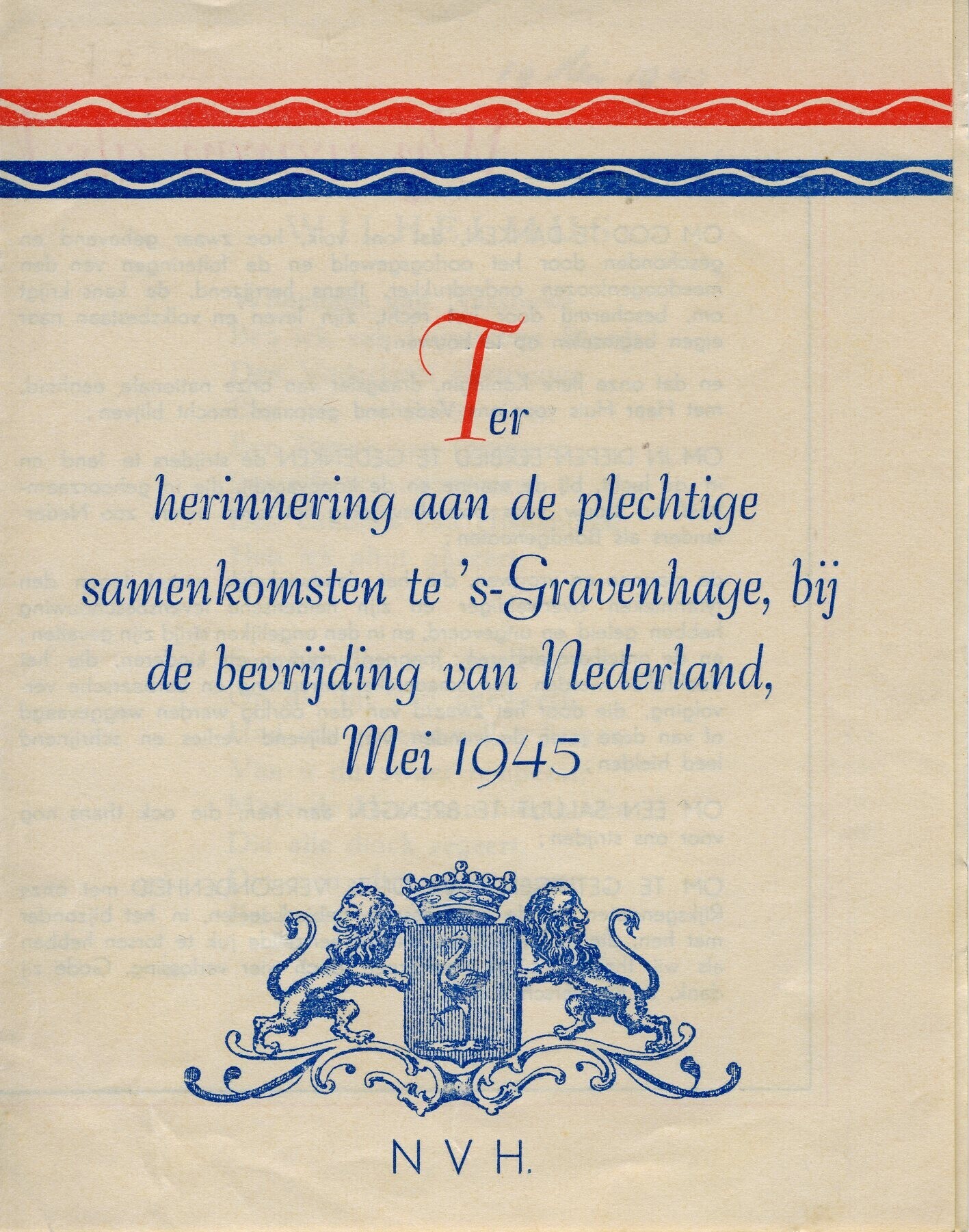 Een gedruk pamflet in de kleuren blauw en rood met de titel: "Ter herinnering aan de plechtige samenkomsten te 's-Gravenhage, bij de bevrijding van Nederland, mei 1945" met op het voorblad de afbeelding van het wapen van Den Haagt. Het drukwerk bevat een tekst onder de titel: "Wij waren als Nederlanders bijeen", twee strofen van het Wilhelmus en het gedicht: "Gelukkig is het land". Toegevoegd is een los blad met de twee strofen van het Wilhelmus en daarop de met pen geschreven datum 19 mei 1945.