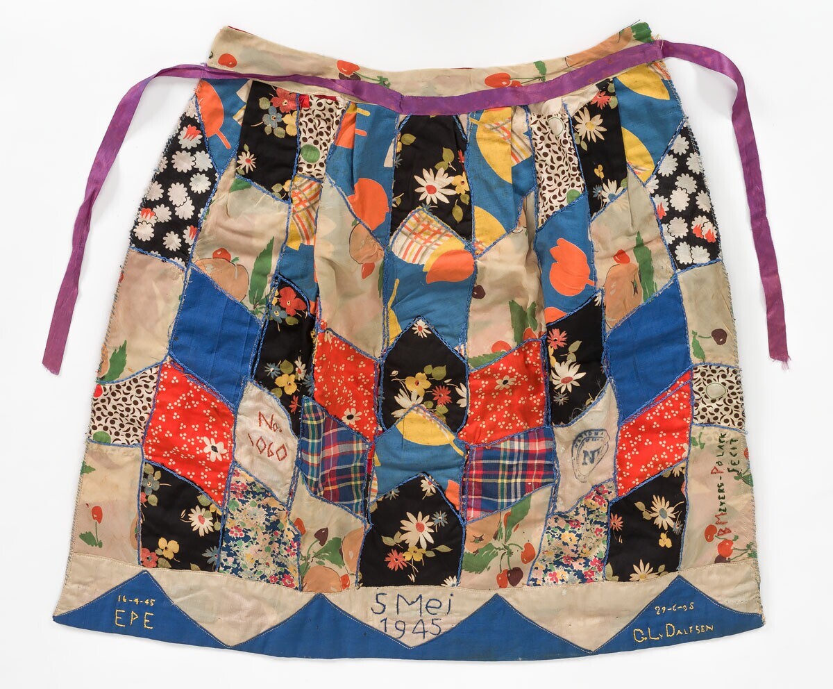 Een lapjesrok gemaakt van restjes stof op een ondergrond van stof bedrukt met een patroon in de kleuren rood, zwart en wit. Aan de bovenkant is een paars lint bevestigd en aan de onderkant een band met driehoeken van lichtblauwe stof. Ter gelegenheid van de bevrijding is met blauw garen de datum "5 mei 1945" aangebracht en met geel garen op de linkerkant: "16-4-45 Epe" met daarboven in oranje garen: "No. 1060". Op de rechterkant is met geel garen: "29-6-05 G.L. v Dalfsen" geborduurd en hierboven is met groen en rood garen geborduurd: "B. Meyers-Polack Fecit". Op de buitenkant van de rok is in het kader van een oorlogskledingtentoonstelling een stempel op de rok gezet: "Nationale - Feestrok samengevoegd op een ondergrond NL 194(?)".<br>Op de achterkant van de rok is een kunststoffen hoesje vastgenaaid met daarin een briefkaart geadresseerd aan G.L. van Dalfsen, Nahuyssingel 3 a, Doesburg met afzender: "Rokken-comité J. Zloch, Hoofdweg 362 (I), Telefoon 80040, Amsterdam (West)". Op de achterkant staat wederom de geadresseerde met geboortedatum 29 juni 1905 en de tekst: "Uw Feestrok is onder nummer 1060 ingeschreven in het rokkenregister van het Nationaal Instituut. Rokkenregister J. Zloch".