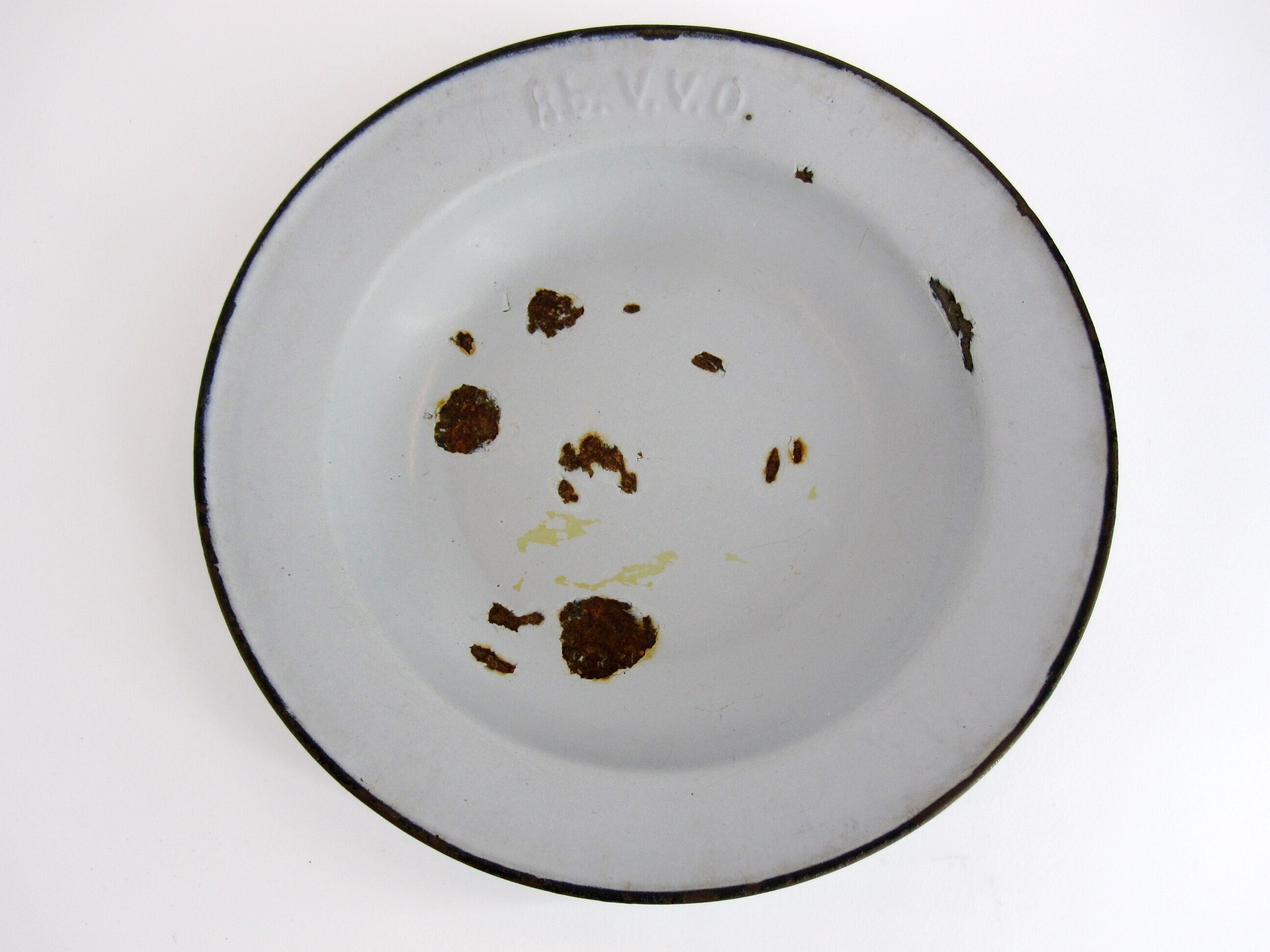 Een grijs geëmailleerd metalen bord met zwarte rand. In de rand van het bord zijn letters gestanst: Rb. V.V.O. wat staat voor Rijksbureau Voor Voedselvoorziening in Oorlogstijd.