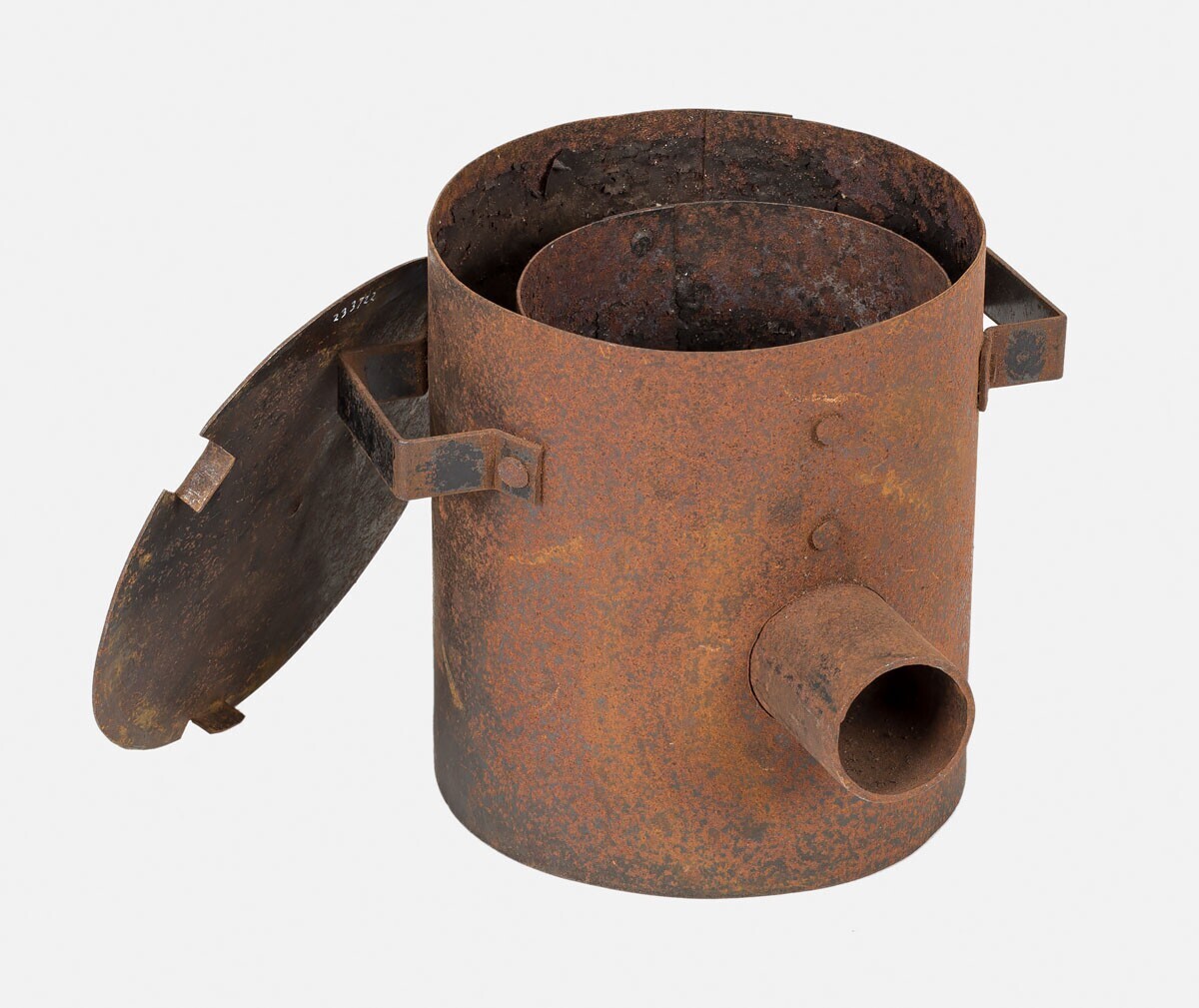 Een metalen speelgoed 'majokachel' met afneembaar deksel. Dit kacheltje is gemaakt door een vervaardiger van majo's in zijn werkplaats in Voorburg voor zijn dochter.