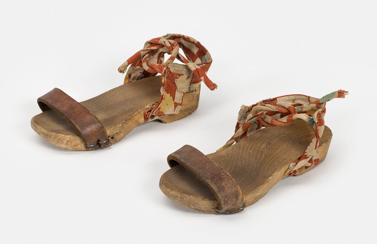Een paar kindersandalen gemaakt uit een houten zool, een leren band voor de tenen en een bedrukte ka...