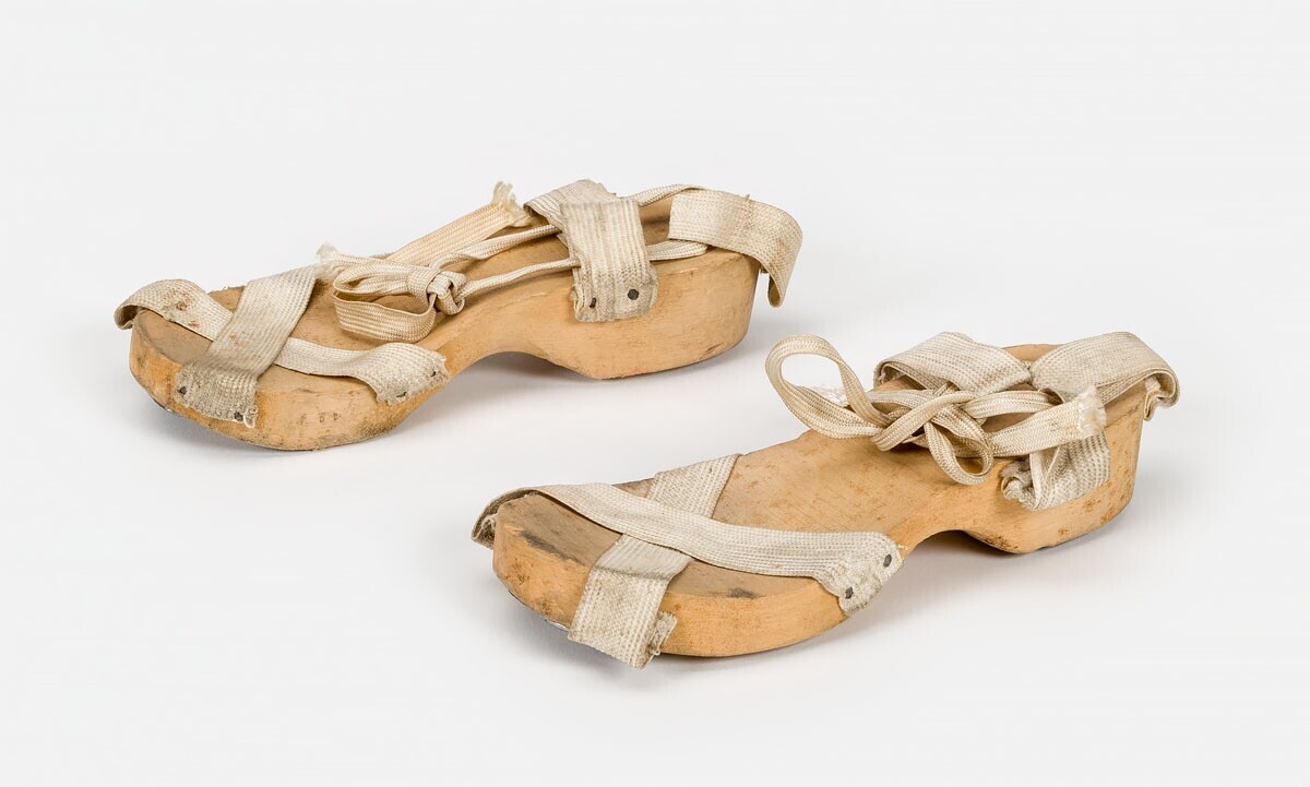 Een paar kindersandalen gemaakt uit een houten zool, twee witte katoenen banden kruislings vastgezet...