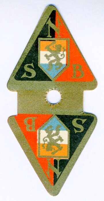 Een papieren vignet met in een goudkleurig kader het logo van de N.S.B. in kleurendruk binnen twee driehoeken die in spiegelbeeld naar elkaar gekeerd zijn. Tussen de driehoeken een goudkleurige band met een ronde uitsparing.