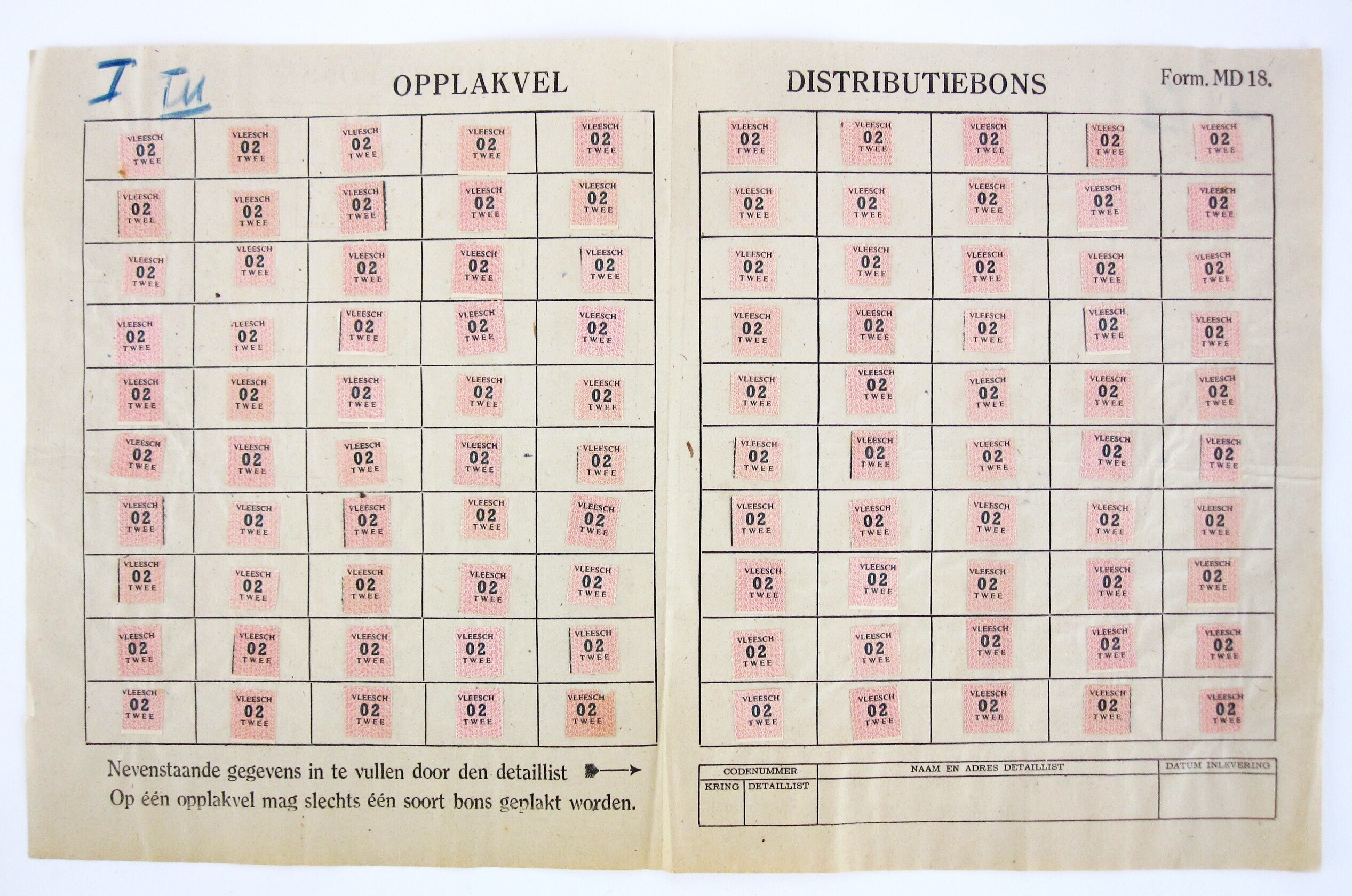 Een "Opplakvel Distributiebons" verdeeld in een raster met in elk hokje een distributiebon voor "Vleesch".