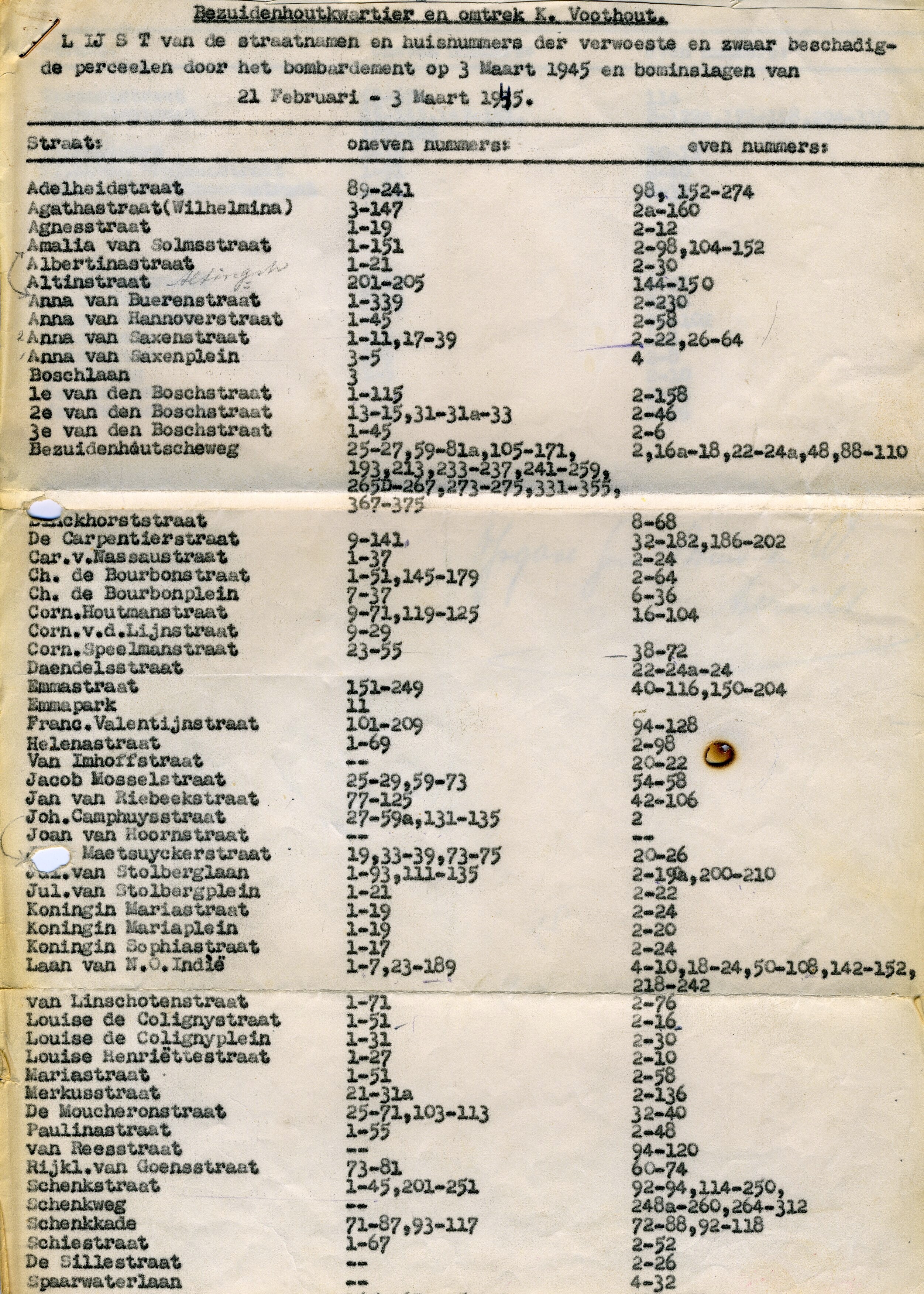 Een uit twee bladen bestaande getypte "Lijst van de straatnamen en huisnummers der verwoeste en zwaar beschadigde perceelen door het bombardement op 3 Maart 1945 en bominslagen van 21 Februari - 3 Maart 1945". Geheel bovenaan: "Bezuidenhoutkwartier en omtrek K. Voorhout." Op het tweede blad staat met pen geschreven: "Opgave gem. Bouw- en W. toezicht".