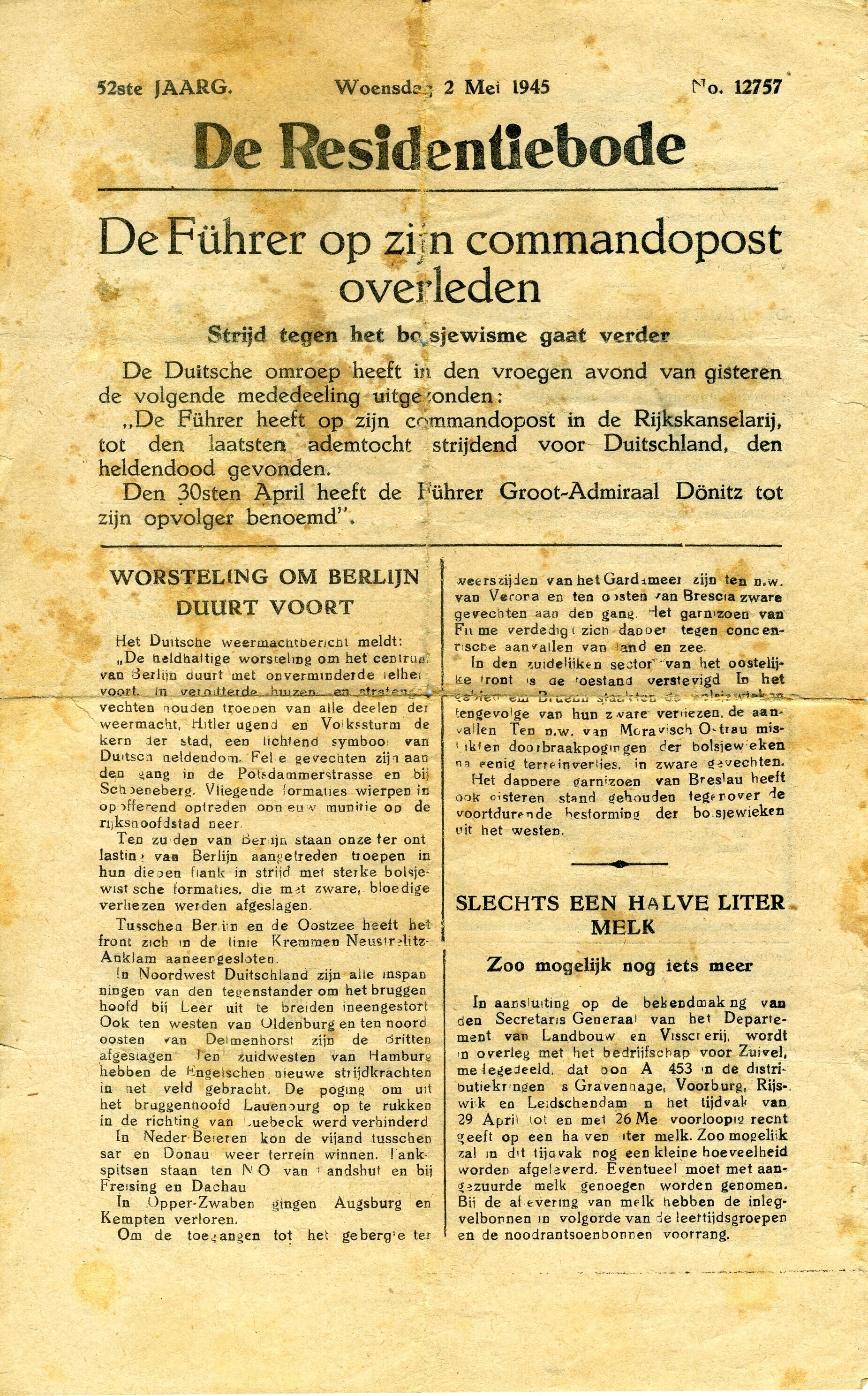 Een krantje bestaande uit één aan beide kanten bedrukt rechthoekig blad papier. Bovenaan: "52ste Jaarg. Woensdag 2 mei 1945 No. 12757 De Residentiebode" met als hoofdartikel: "De Führer op zijn commandopost overleden".