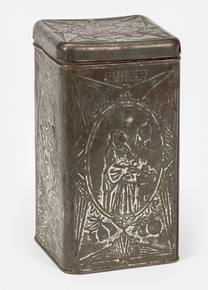 Een metalen suikerblik waarin taferelen in reliëf zijn aangebracht naar schilderijen van zeventiende eeuwse Hollandse meesters. Tijdens de Tweede Wereldoorlog is dit blik gebruikt als broodbakblik. Het Haagse gezin ging met de fiets voedsel halen bij familie in Kamperveen. Onder andere meel (of graan) werd meegenomen naar huis. Daarmee werd brood gebakken in het suikerblik. Van dat brood werd elke kruimel opgegeten.