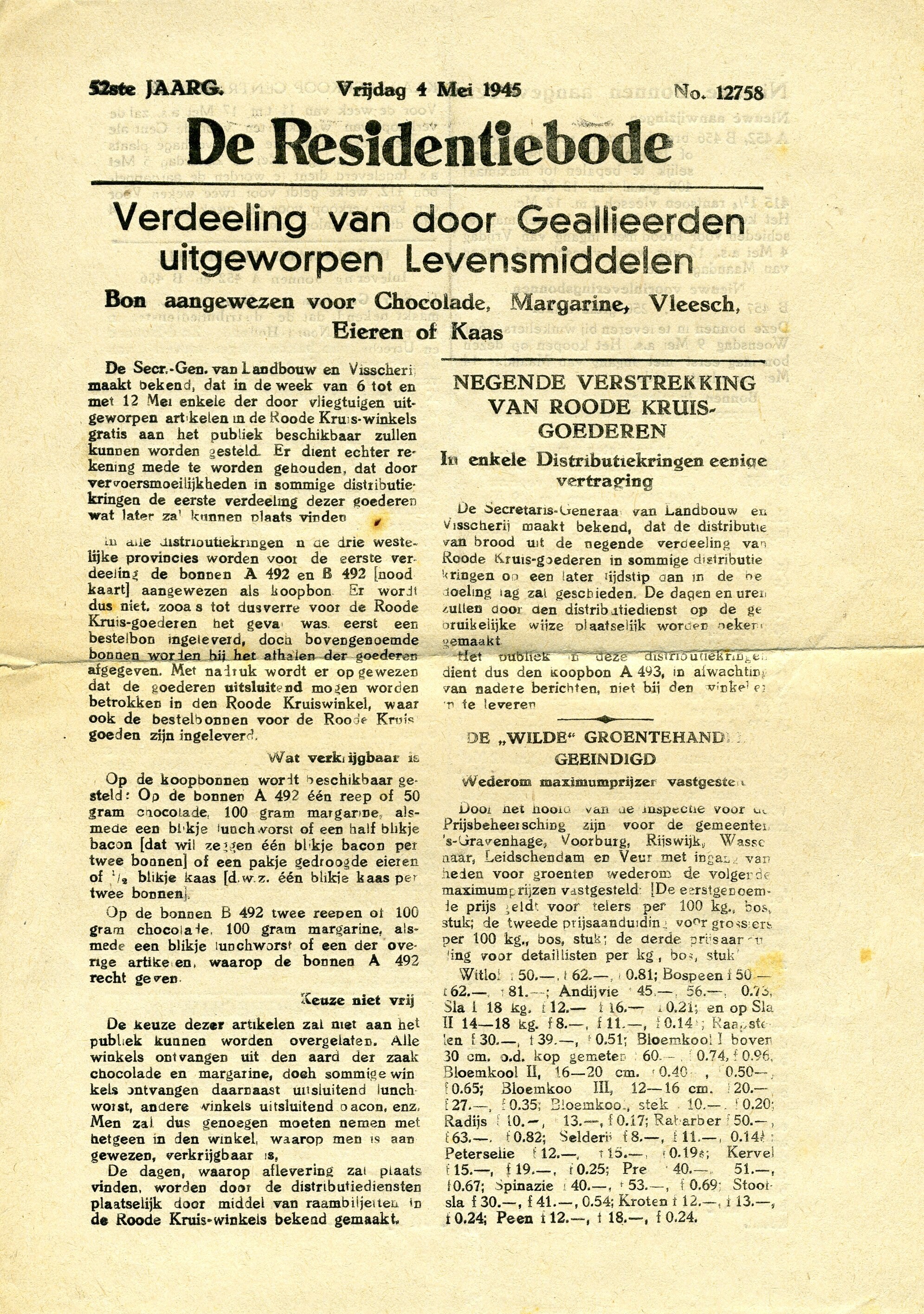 Twee gedrukte krantjes van verschillend formaat. Het gaat om uitgaven van "De Residentiebode": Dinsdag 1 mei 1945 met als hoofdartikel: "Groote slag om Berlijns centrum duurt nacht en dag voort"; Vrijdag 4 mei 1945 met als hoofdartikel: "Verdeeling van door geallieerden uitgeworpen levensmiddelen".
