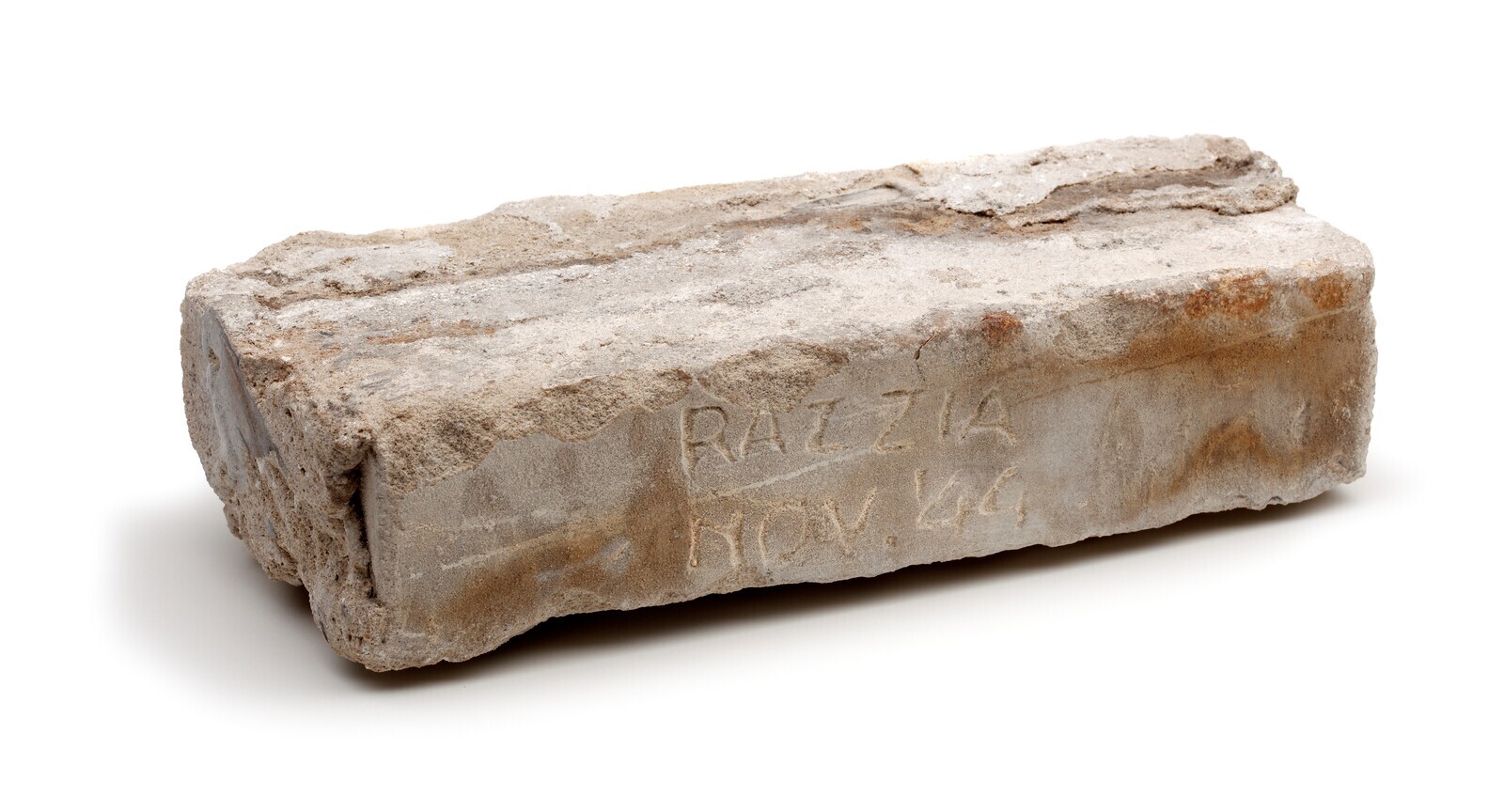 Een baksteen uit de fundering van de uitbouw van het huis aan de Columbusstraat 222 te Den Haag. In deze steen is gekrast: "Razzia Nov. '44". De kruipruimten van de huizen aan de Columbusstraat waren verbonden met elkaar, zodat bij een razzia de onderduikers snel konden vluchten. Vermoedelijk heeft een onderduiker de tekst in de steen aangebracht.