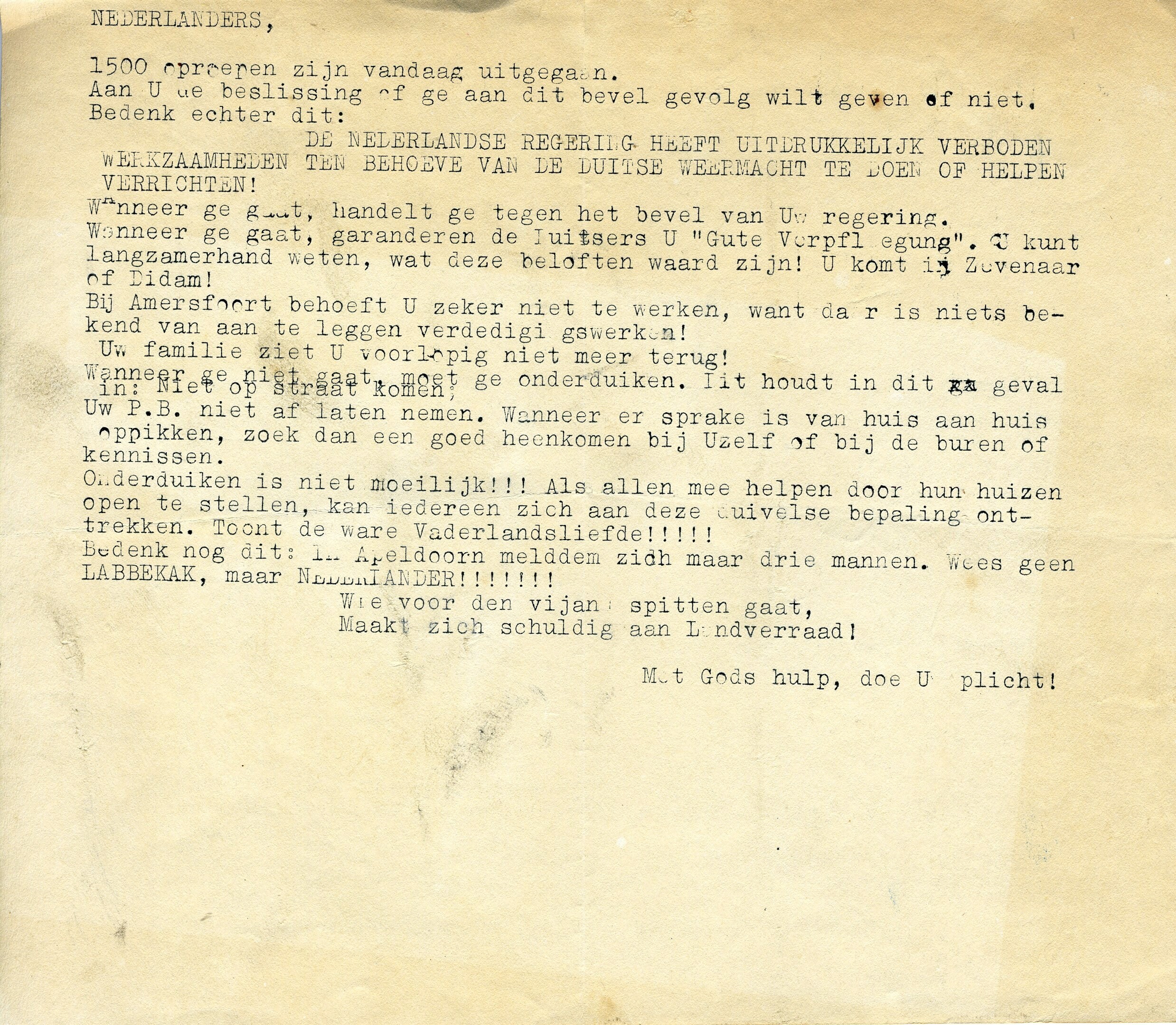 Een gestencild pamflet met een oproep om geen "werkzaamheden ten behoeve van de Duitse Weermacht te doen of helpen verrichten!"