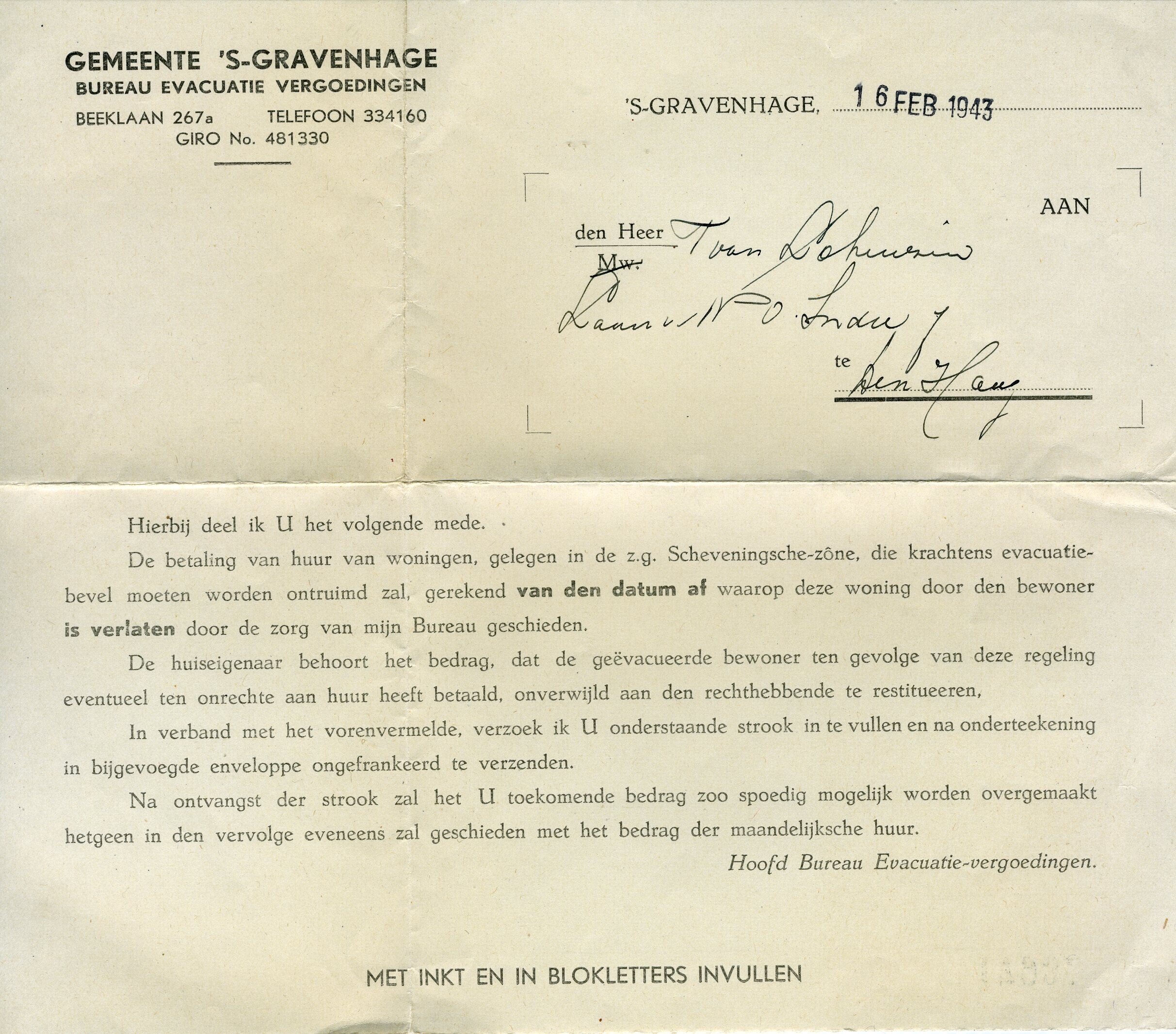 Een voorgedrukte brief van de "Gemeente 's-Gravenhage Bureau Evacuatie Vergoedingen" aan de heer T. van Lohuizen te Den Haag met datum 16 februari 1943. De brief gaat over de betaling van de huur van woningen in de "Scheveningsche-zône" die moesten worden ontruimd voor de Atlantikwall.