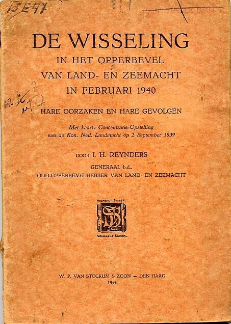 Een boek met een oranje kaft met een los bijgevoegde kaart: "concentratieopstelling van de Koninklijke Nederlandsche Landmacht op 2 september 1939". Het boek is geschreven door I.H. Reynders, oud-opperbevelhebber van de land- en zeemacht. In het boek beschrijft hij zijn onderzoek naar oorzaken van de capitulatie van het Nederlandse leger in mei 1940.