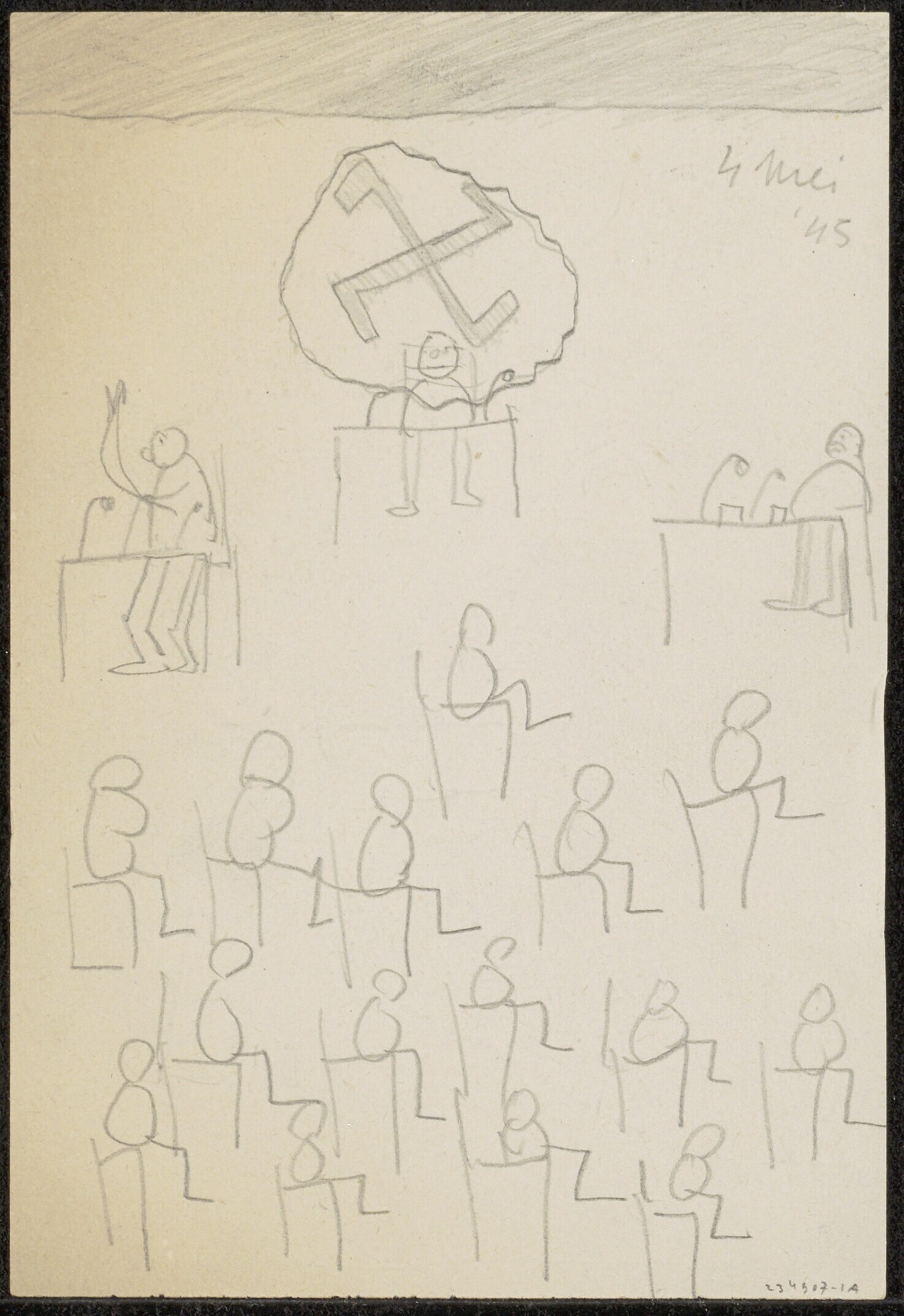 Twee potloodtekeningen van bijeenkomsten van de Nazi-partij. Op de achterkant van één van de tekeningen vermoedelijk een afbeelding van Hitler.
