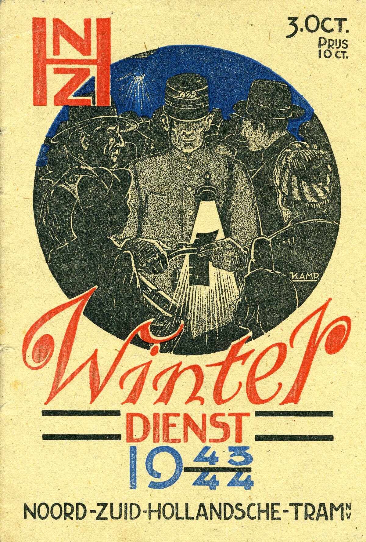 Een dienstregeling van de "Noord-Zuid-Hollandsche-Tram N.V." uitgegeven op 3 oktober 1943 voor de "Winterdienst 1943-1944". Op de voorkant een afbeelding van een conducteur die kaartjes knipt onder een naar beneden schijnend lampje vanwege de verduistering.