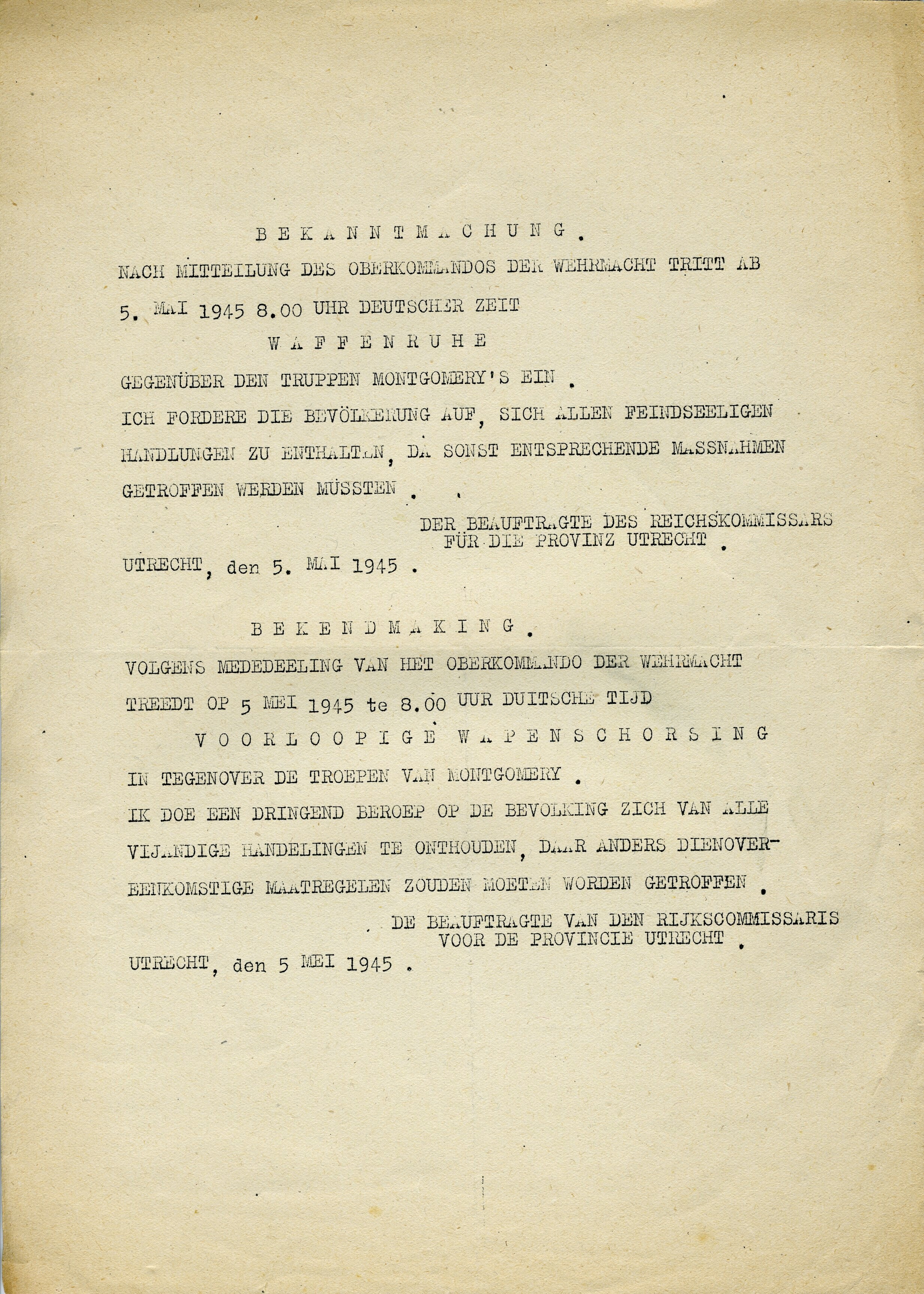 Een formele verklaring in het Duits en het Nederlands van het afkondigen van de wapenstilstand op 5 mei 1945 om 8.00 uur "Duitsche Tijd" door: "Der Beauftragte des Reichskommissaris für die Provinz Utrecht".