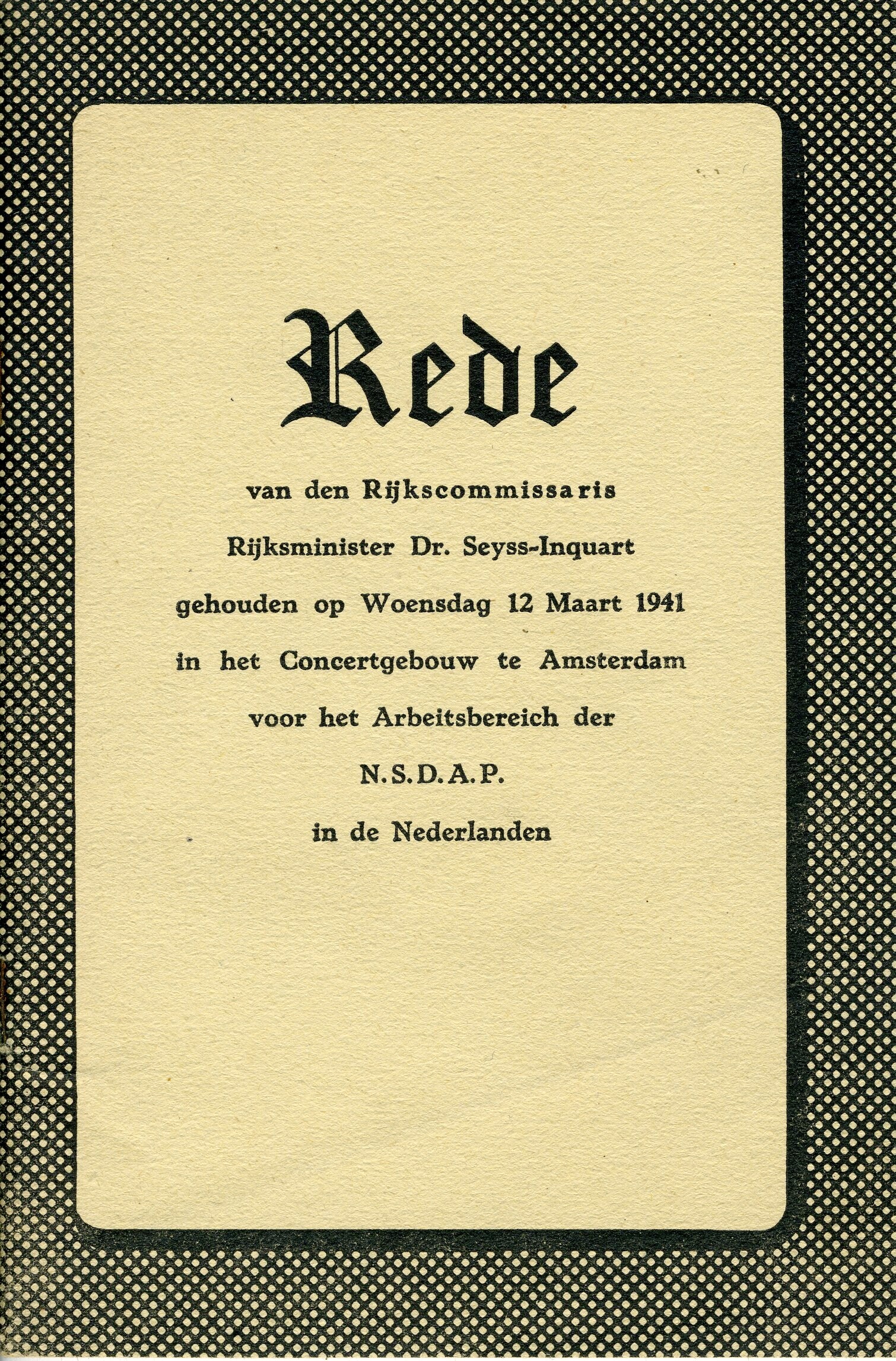 Een in een gedrukt boekje uitgegeven: "Rede van den Rijkscommissaris Rijksminister Dr. Seyss-Inquart gehouden op Woensdag 12 Maart 1941 in het concertgebouw te Amsterdam voor het Arbeitsbereich der N.S.D.A.P. in de Nederlanden". Toegevoegd is een los vel papier met daarop een gedrukt voorwoord door: "De Secretaris-Generaal van het Departement van Volksvoorlichting en Kunsten.