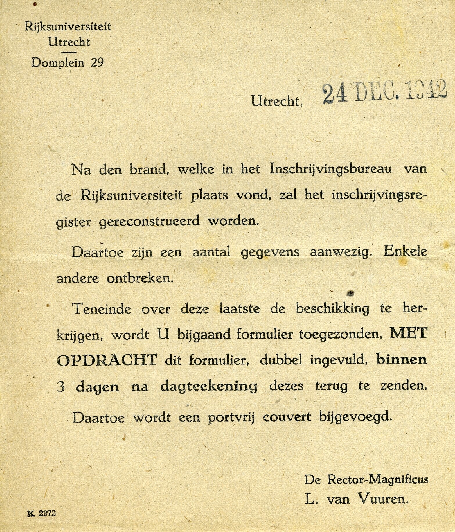 Correspondentie bestaande uit twee enveloppen, twee gedrukte brieven en een in te vullen formulier van de Rector-Magnificus van de Rijksuniversiteit Utrecht, waarin om gegevens gevraagd worden die na de door het verzet aangestoken brand in het inschrijfbureau van de universiteit verloren waren gegaan. De geadresseerde is een studente met woonadres in Den Haag.