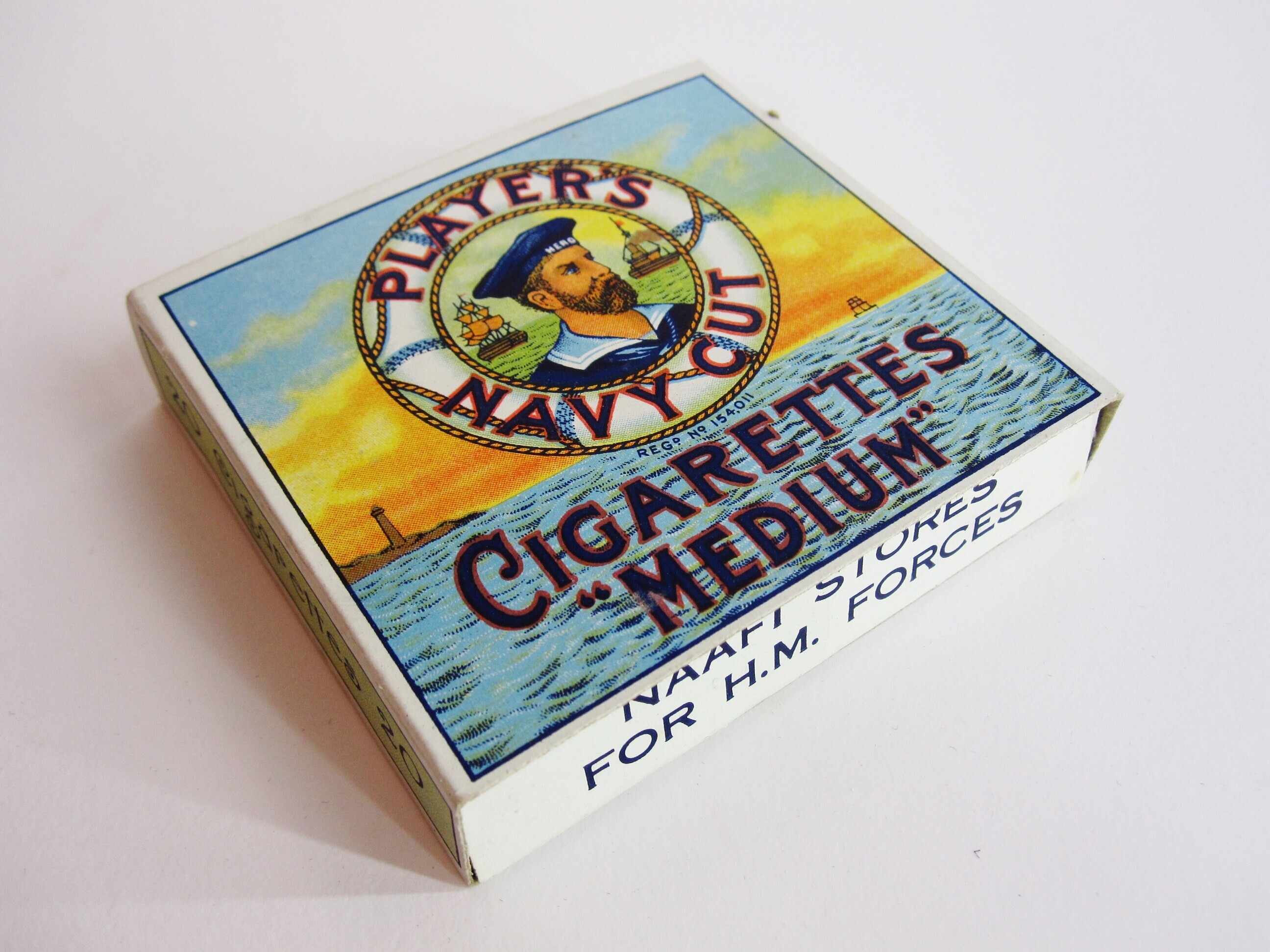 Een kartonnen verpakking met daarop in kleurendruk de afbeelding van een matroos tussen een zeilschip en een modern schip in een kader gevormd door een reddingsband. Op deze pand staat: "Player's Navy Cut" Dit tegen de achtergrond van een zeegezicht met onder de band: "Reg. No. 154.011 Cigarettes "Medium". Op een zijkant staat: "NAAFI Stores for H.M. Forces".