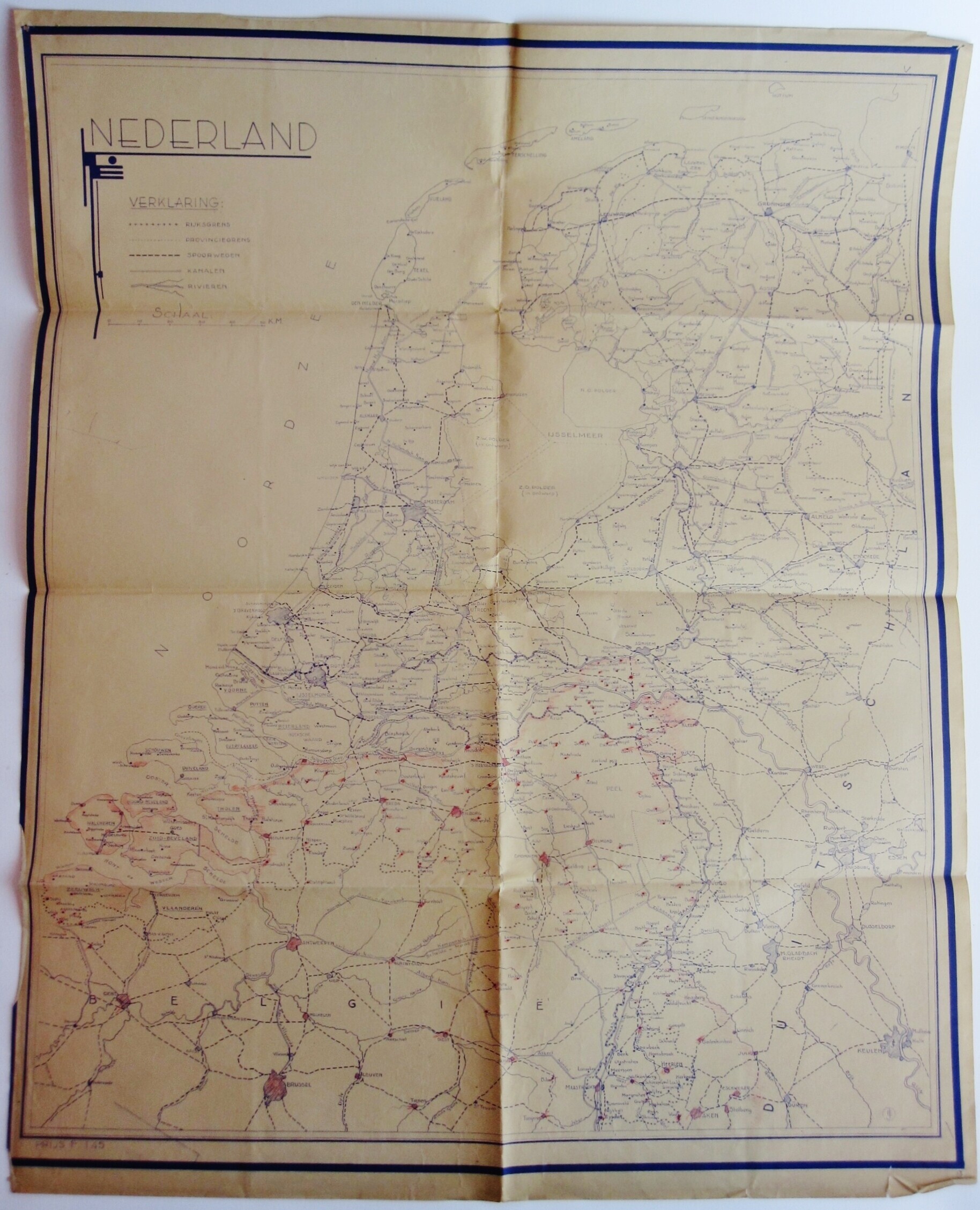 Een gedrukt kaart van Nederland waarop met rood potlood de vorderingen aan het einde van 1944 van de geallieerden in het Zuiden en Oosten van Nederland zijn aangegeven.