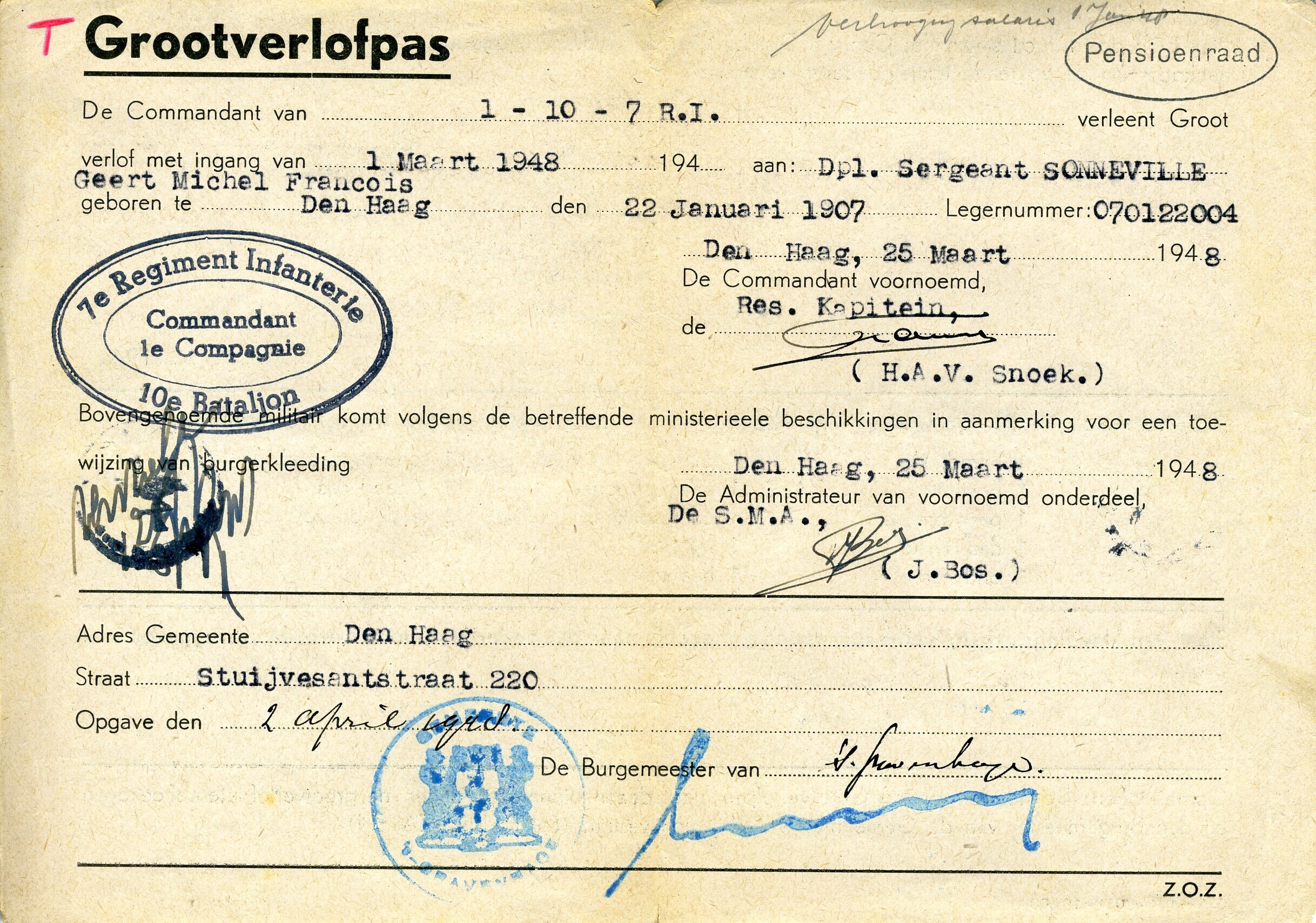 Een "Grootverlofpas" voor "Dpl. Sergeant Sonneville Geert Michel François", waarbij aan hem verlof wordt toegekend met ingang van 1 maart 1948. De pas is gedagtekend: Den Haag, 25 maart 1948 en voorzien van het stempel van de "Commandant 1e Compagnie 7e Regiment Infanterie 10e Bataljon".