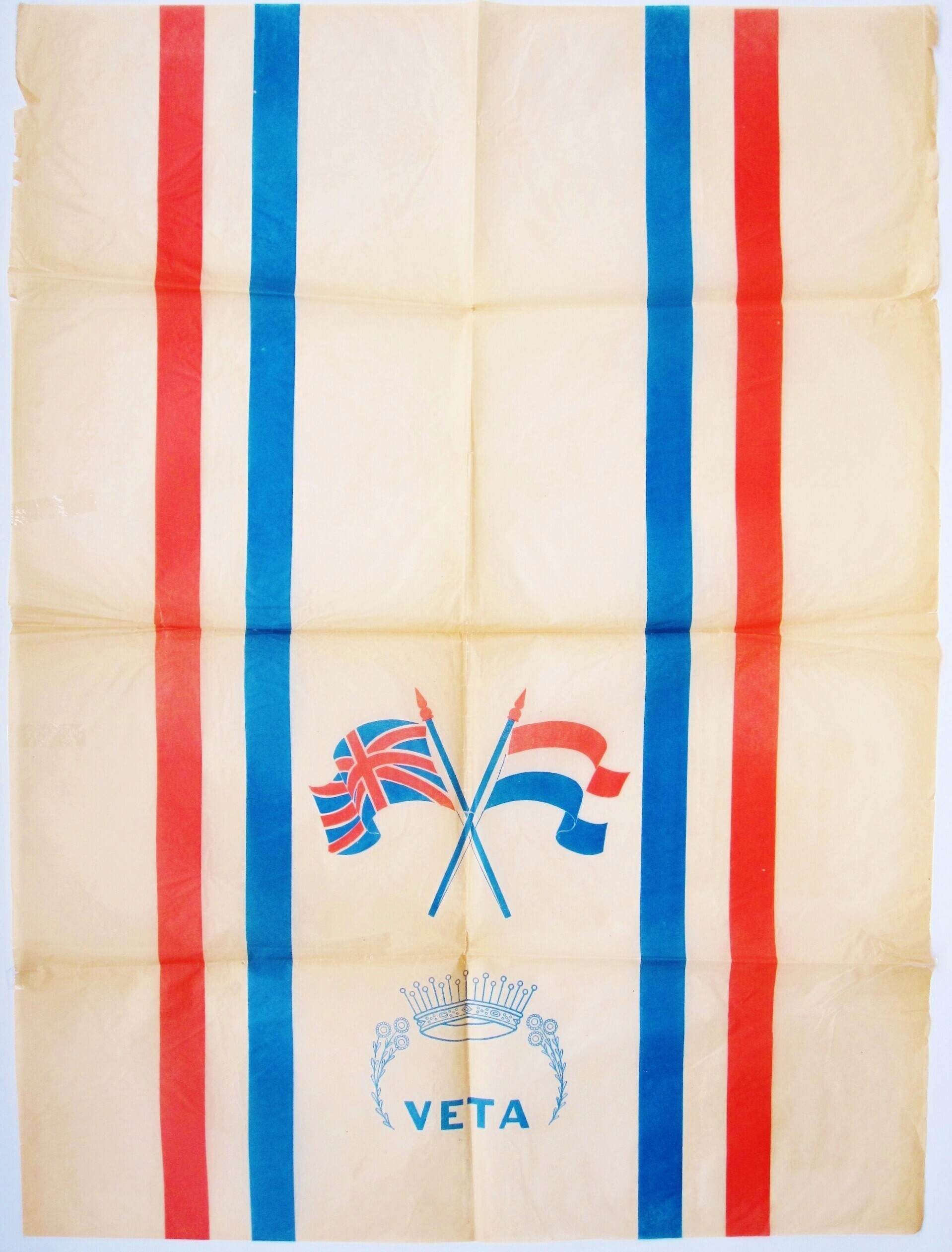 Een rechthoekig blad wit papier bedrukt in rood en blauw met de Nederlandse en de Engelse vlag, daaronder een kroon met tussen bloemen: "VETA" (N.V. Vereeniging Export Tuinbouw Artikelen). Langs beide randen een band in de kleuren rood wit en blauw.