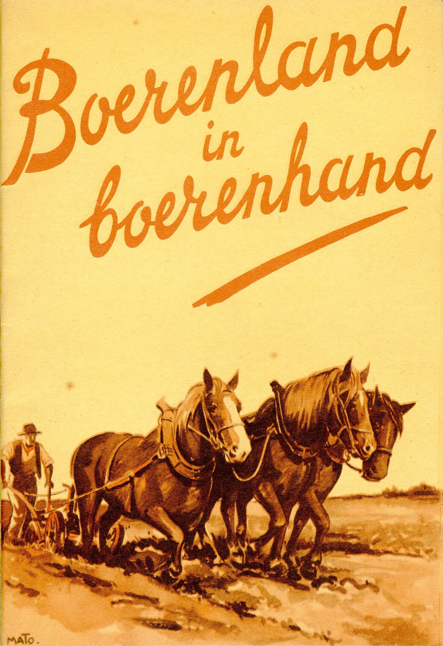 Twee geïllustreerde boeken getiteld: "Boerenland in boerenhand" met op de kaft een boer achter een door drie paarden getrokken ploeg. Het boek is: "Samengesteld door het Departement van Volksvoorlichting en Kunsten Afd. Algemeene Propaganda Uitgave Uitgeverij "de Schouw". Het bevat Nationaalsocialistische propaganda gericht op de Nederlandse boerenstand.