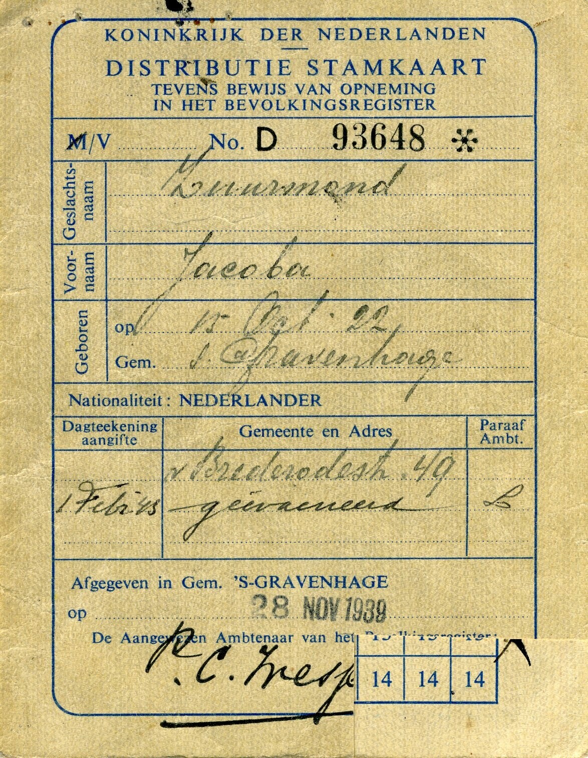 Een "Distributie Stamkaart tevens bewijs van opneming in het bevolkingsregister" afgegeven de datum 28 november 1939 door de gemeente Den Haag op naam van Jacoba Zuurmond. Op het bewijs zijn naast haar personalia, haar adres, de datum 1 februari 1945 van haar evacuatie en ook haar beroep als "Dagmeisje" per 26 september 1940 genoteerd.