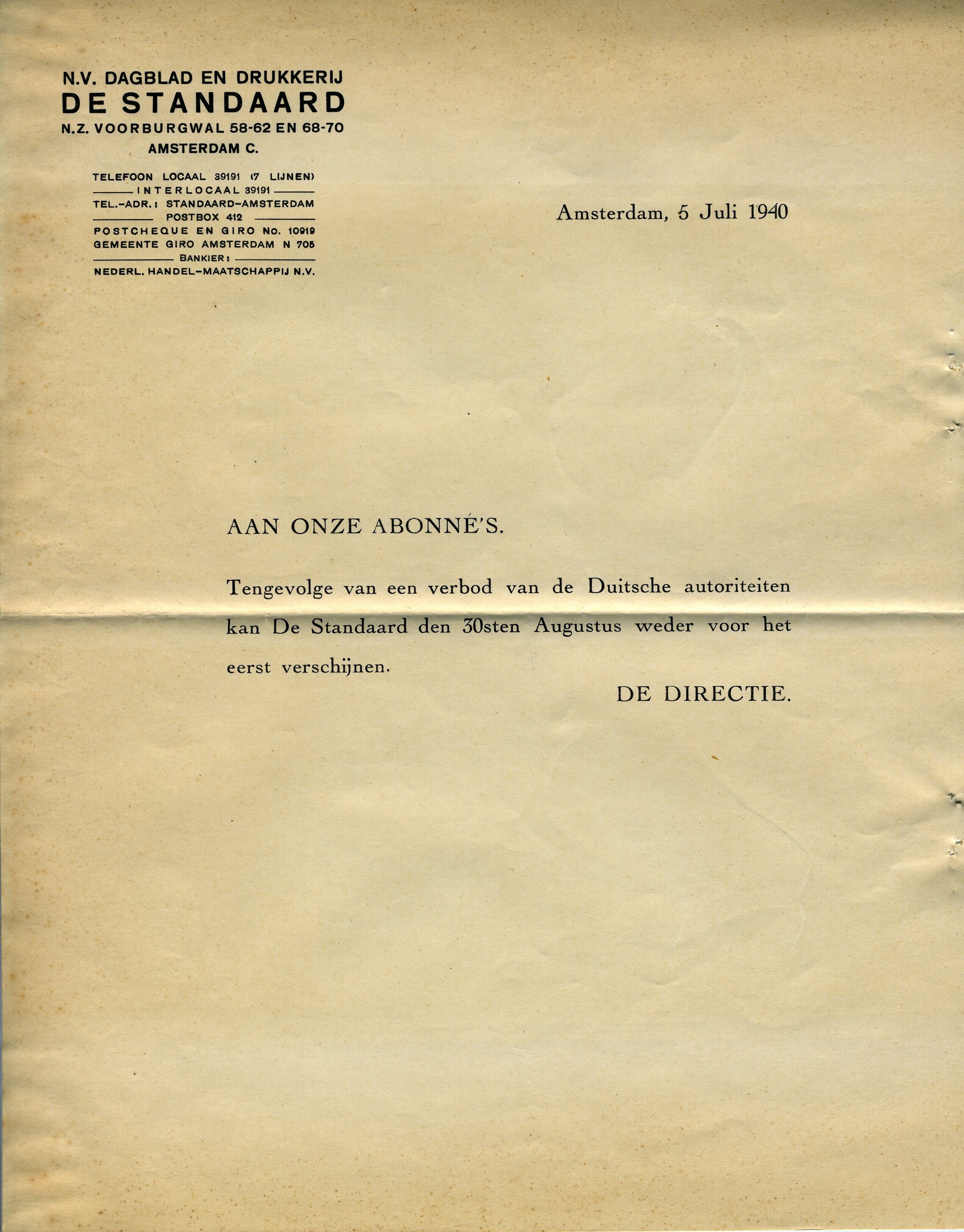 Een brief van N.V. Dagblad en Drukkerij De Standaard gedateerd: Amsterdam, 5 Juli 1940 met een bericht aan de abonnees dat door "een verbod van de Duitse autoriteiten kan De Standaard den 30sten Augustus weder voor het eerst verschijnen".