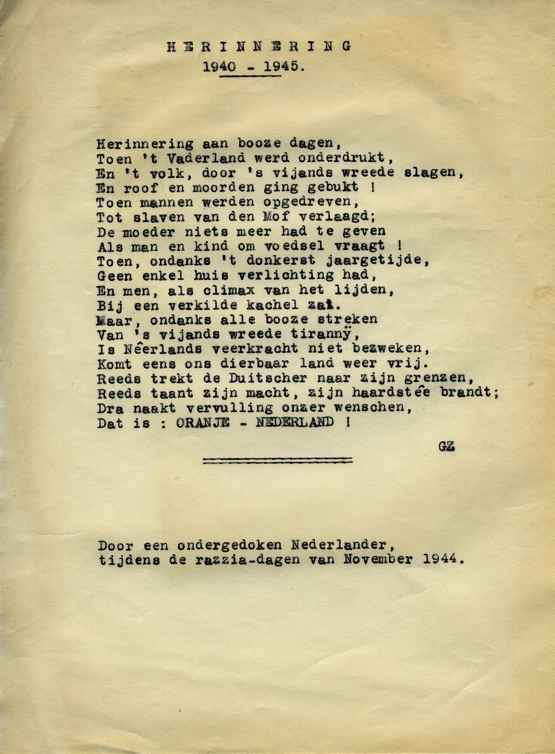 Een bundel getypte en met de hand geschreven gedichten waarmee de spot wordt gedreven met de bezetter, maar ook een aanklacht zijn tegen het gedrag van dezelfde bezetter en diens collaborateurs. Toegevoegd zijn een brief van de N.S.B. en twee verklaringen van de opperbevelhebber van Land- en Zeemacht H.G. Winkelman.