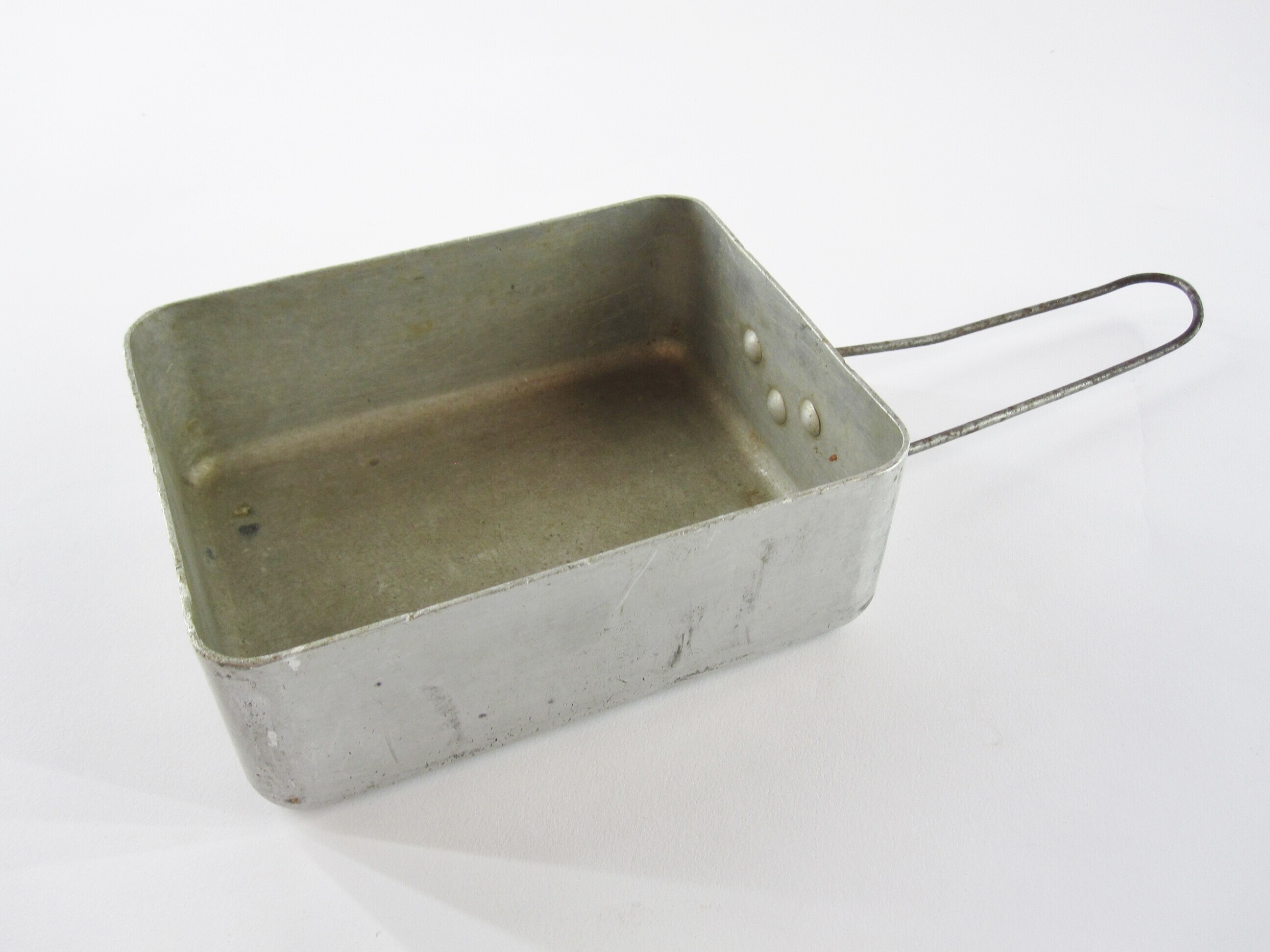 Een aluminium mesting met inklapbaar ijzeren handvat uit de uitrusting van F.G. Koch, beroepsmilitair bij het Regiment Genietroepen van de Koninklijke Landmacht. Op de onderkant staat: "Registered Trade Mark. Made in Canada. W.D.S. & Co. Duro Aluminium".