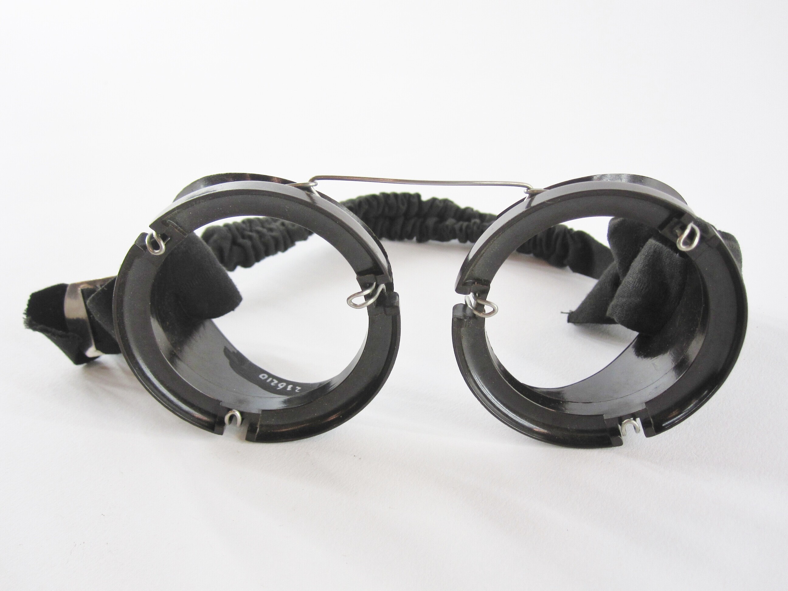 Een bakelieten stofbril zonder glazen met katoenen hoofdband voor gebruik in motorvoertuigen uit de uitrusting van F.G. Koch, beroepsmilitair bij het Regiment Genietroepen van de Koninklijke Landmacht. De bril is versterkt met metalen beugels.
